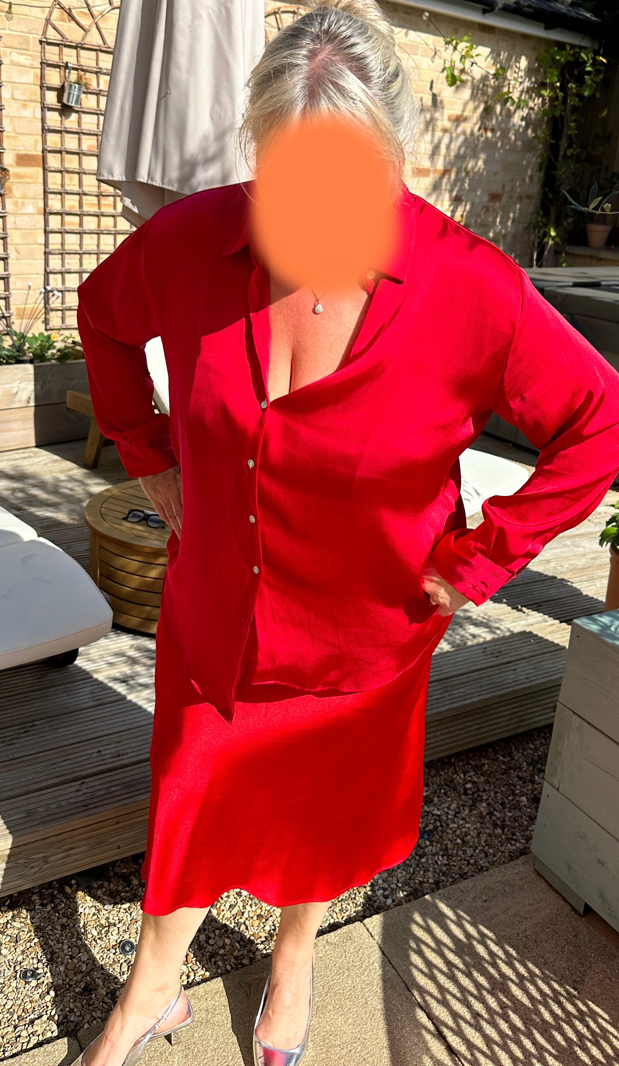 My wife in a red satin dress and shirt