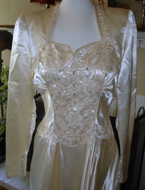 I've done a lot of research on the different types of Satin thru the years. If it was pre world war 2 it was probably Silk Satin or Rayon Satin. When the war broke out there was a shortage of silk , because they need silk to make parachutes. So probably 99% of the gowns were Rayon Satin. There was one major company that developed Rayon Satin and that was The Skinner Satin Co. of Boston. Most of the real smooth shimmering satin found in bridal gowns and formal gowns from the late 30's and up to the 50's was Skinner Rayon Satin. In my opinion rayon satin is the smoothest and most shimmering satin around. Unfortunatley they don't make it anymore. It's sometimes is called slipper satin.Then along came Acetate Satin which is very smooth and silky and shimmery (I"m getting horny just writing about satin).