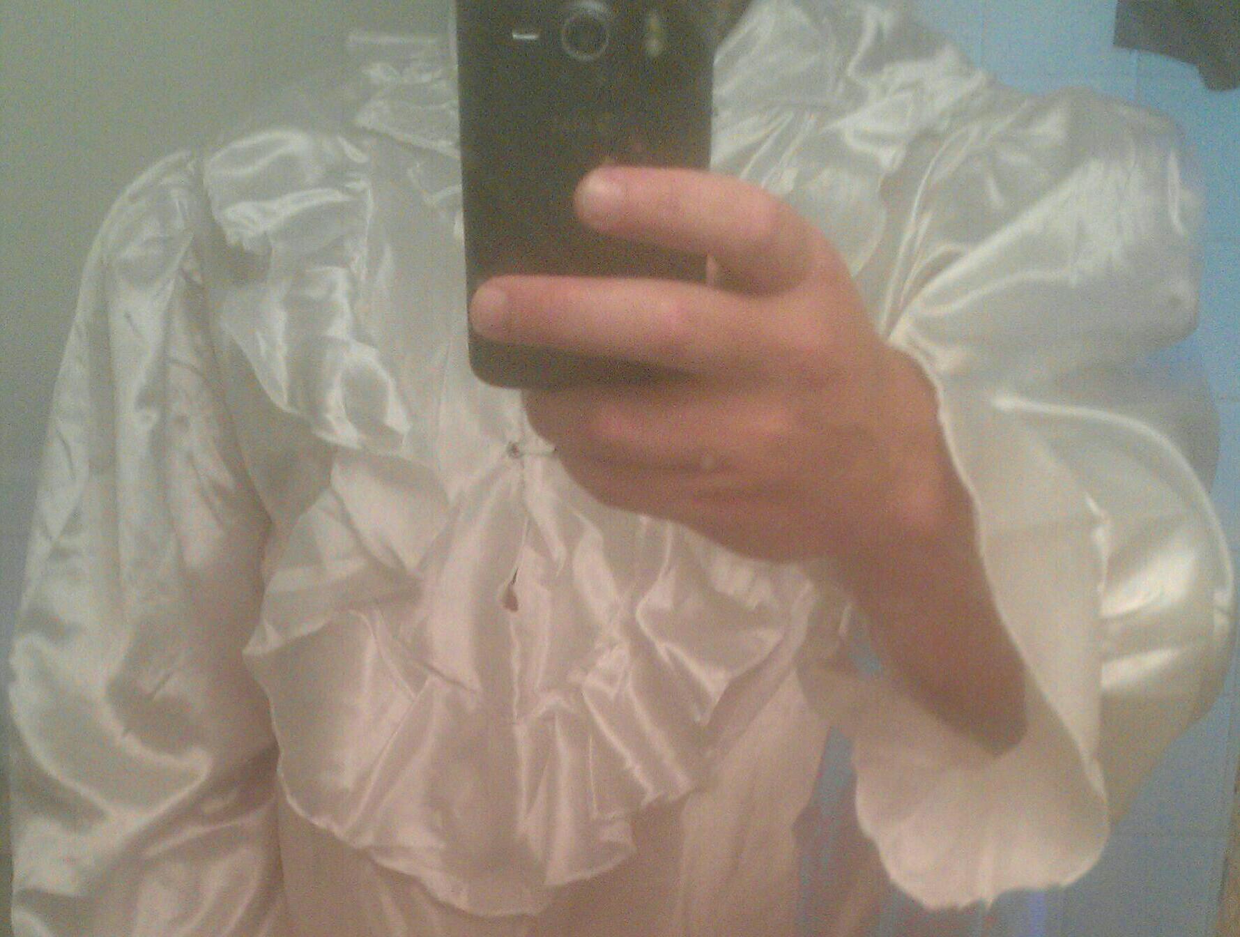 My new white shiny, slippery, ruffly poofy sleeved pirate like satin blouse!! The billowy sleeves make me weak in knees as does the super femme ruffly front!! The back is amazing too! Slick, shiny, shimmery..omg!! Can't wait to cum into it!!