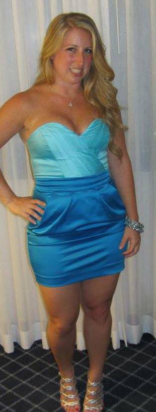 Well sort of. Wore a tight shirt and jeans, her tits looked amazing and saw glimpse of pink satin bra strap. Assuming a matching shiny pink skimpy satin thong or full back string bikini...if I'm dating her and We go to wedding I'm making her wear that blue dress!!