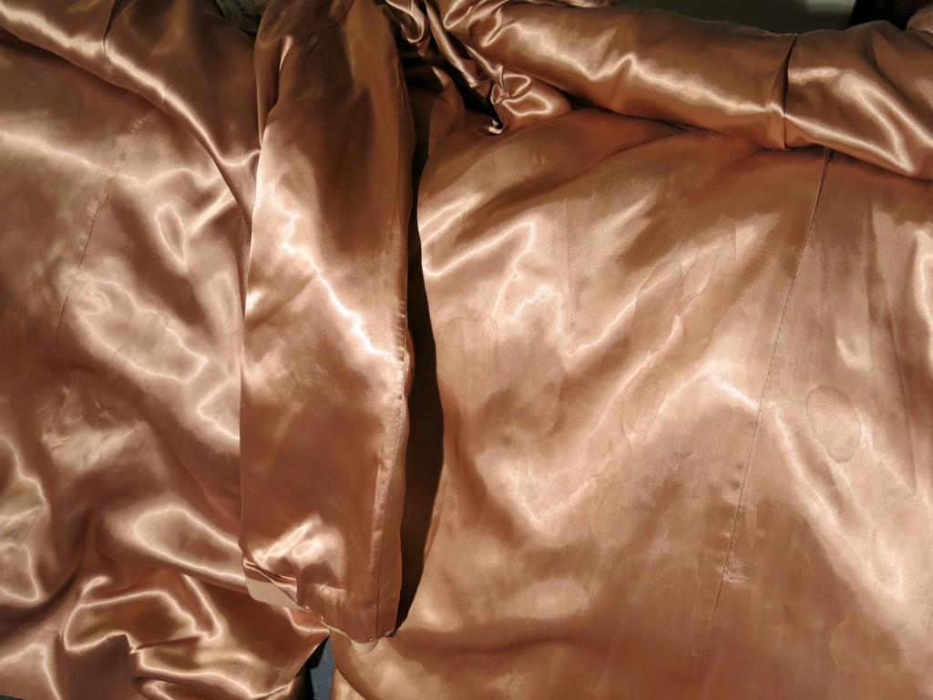 One of my gold satin lined cashmere coats.I have dropped many loads of my cum on this smooth satin coat lining.
