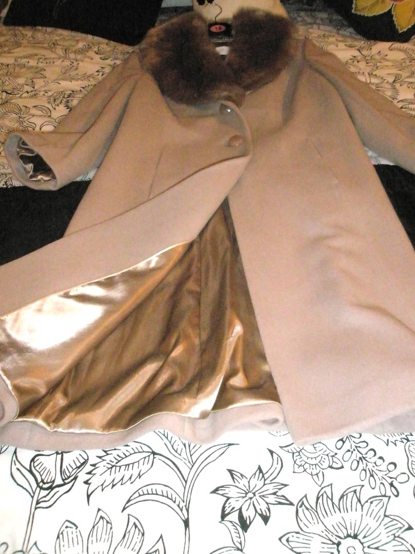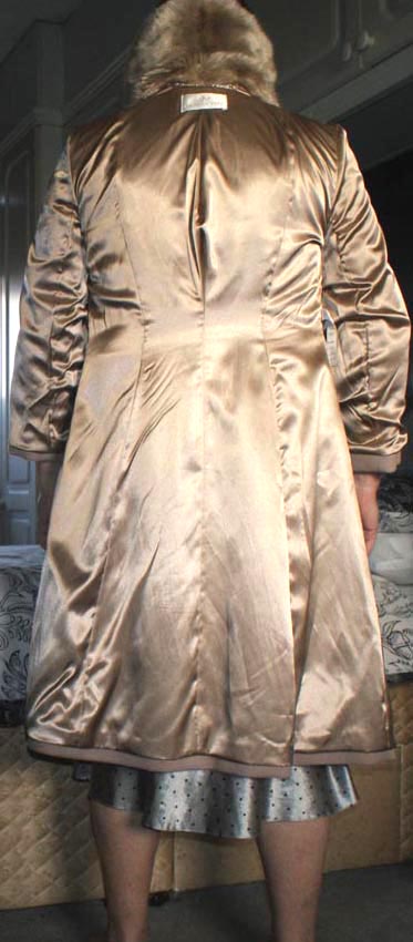 The brown coat is still a virgin. I have 3 of those coats and am saving the new one for a special occasion. They all have the real high thread count heavy super smooth bridal satin with mink collars. I don't mind paying a little more for them on Ebay, worth every penny.