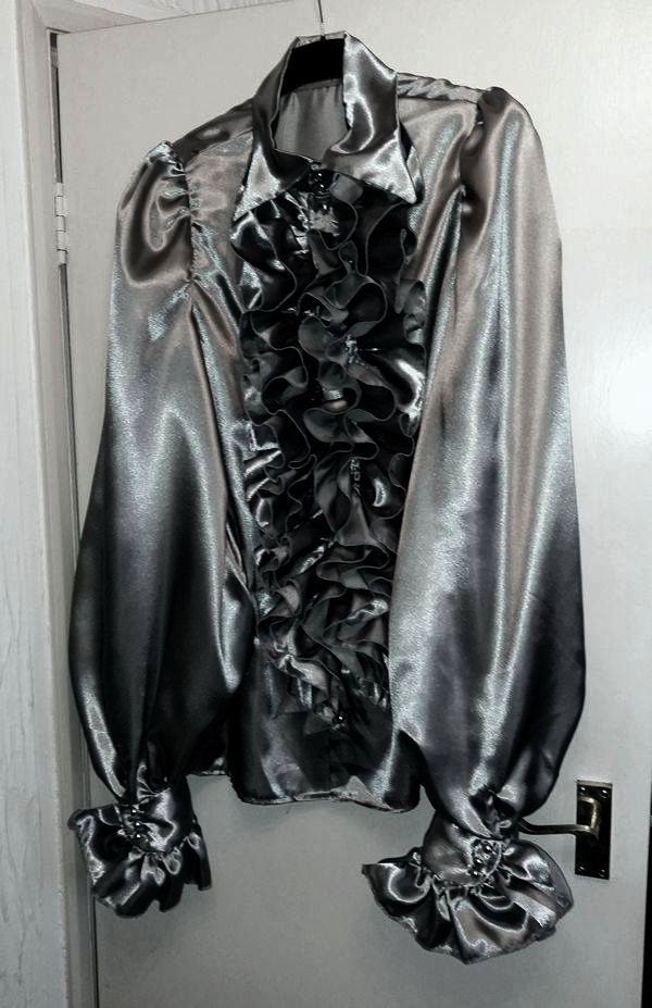 It's made from a very shiny silver-grey satin with a massive bush of triple-layer ruffles sticking out from the front and more of them on the cuffs of the big puffed sleeves. It has domed chrome buttons all down the front with two on the extra-deep collar and three on each extra-deep cuff. Very retro 70s style!