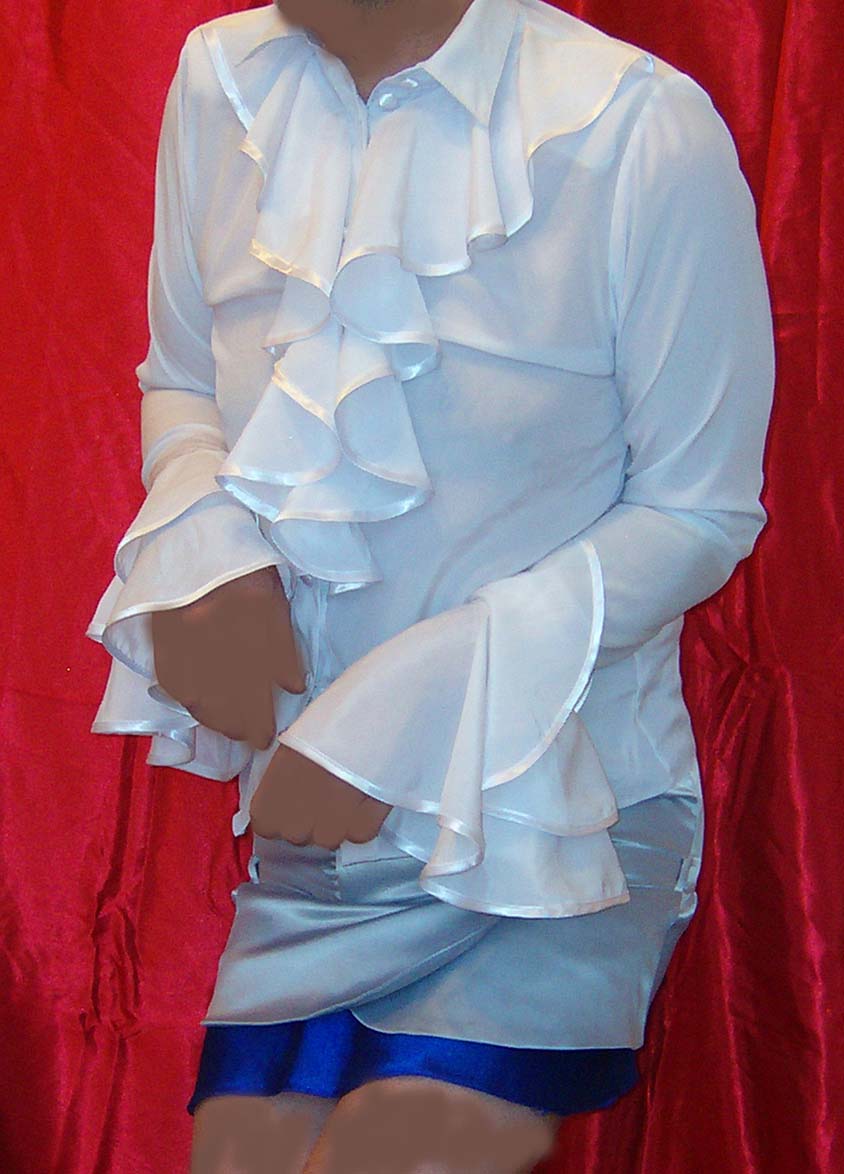 I normally wear T-shirts so it feels kind of strange wearing a blouse - especially one of those big frilly blouses in a retro style. It takes time to get used to the unaccustomed weight of a big mass of ruffles on you but it's also kind of erotic to feel them bouncing around on the front of your body between the big puffed sleeves billowing out round your arms as you walk along.