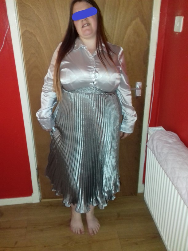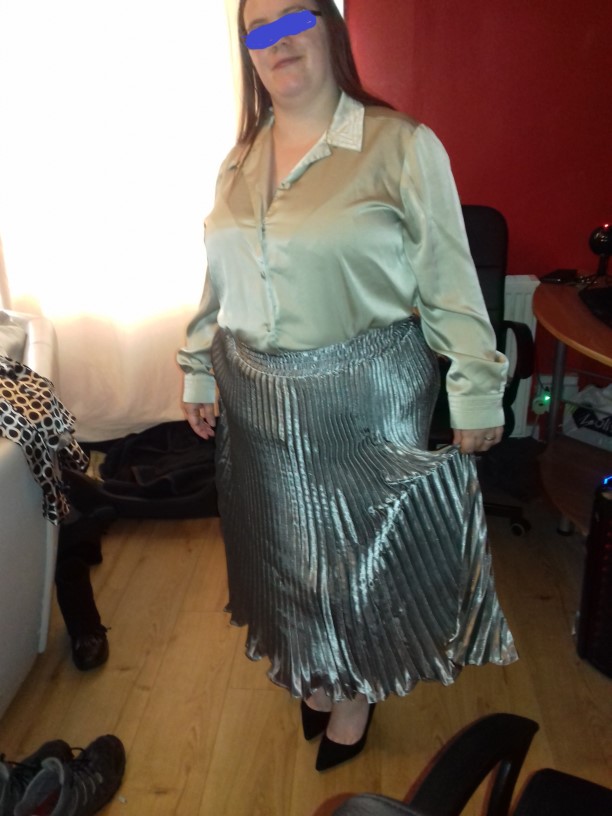 Love that combination of blouse and pleated skirt, the colour is perfect but don't you think pleated satin has that special WOW factor. The skirt would go well with one of those satin blouses with big billowy sleeves and a huge pussy bow, the more material the better, well done.