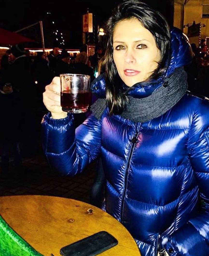 Blonde wearing black plastic puffer and shiny lycra nylon leggings