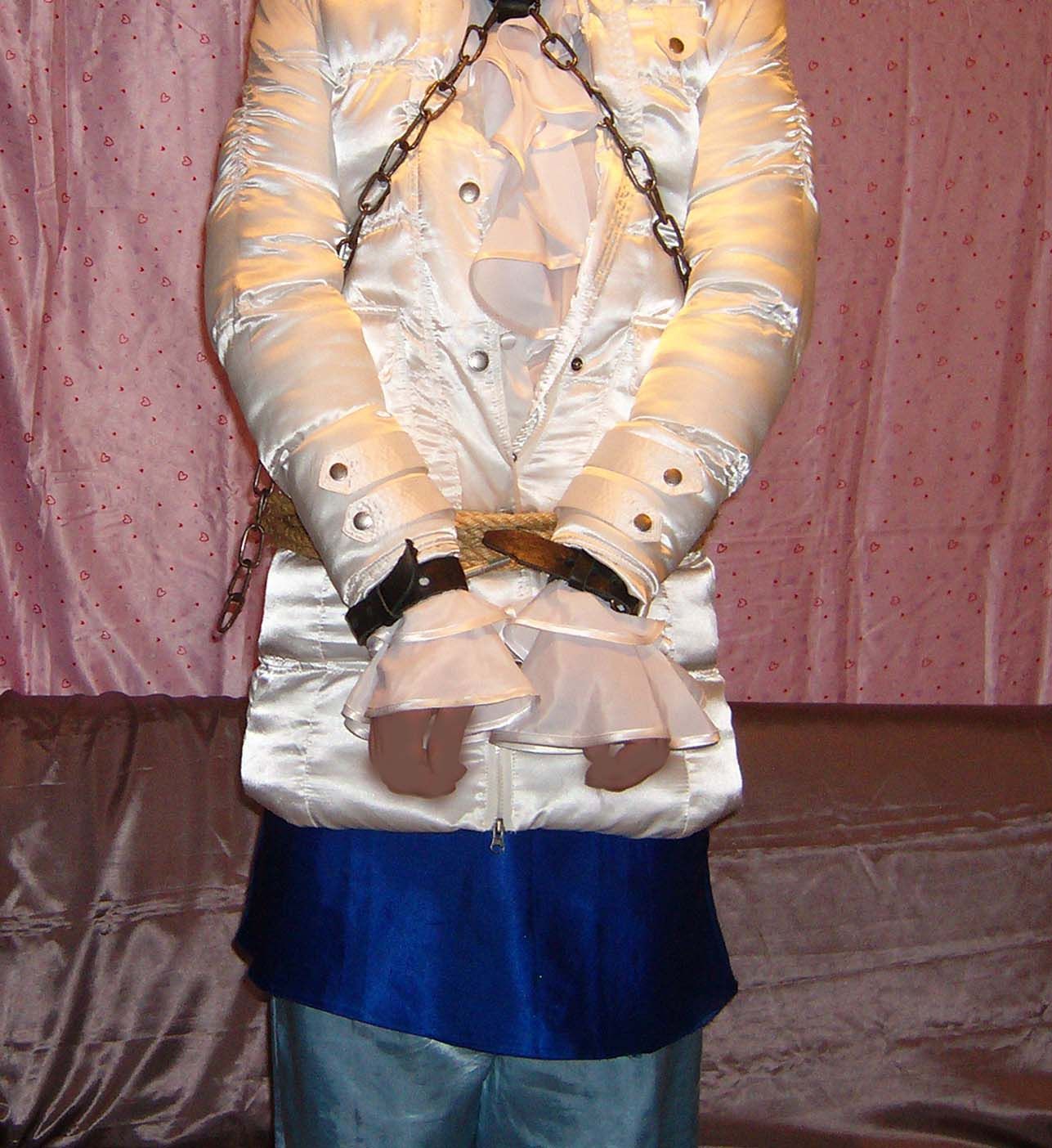 I love such fun very much when my lady tells me to wear a slippery gala blouse and skirt and a satin jacket for my bare body and then binds me tightly with cords and chains so that I can't move. Then I lie tied to a bed with satin sheets and I have a panic that I can't free myself. Later, my lady puts a vibrator on my penis and leaves the house for a few hours while I am experiencing some wonderful orgasms. Before leaving the house, my lady scares me that she will bring her friends home soon so that they can see how stupid I look. This situation causes me great fear and shame that they will see me in women's clothes when I get orgasm but I can not do anything and I am even more excited.