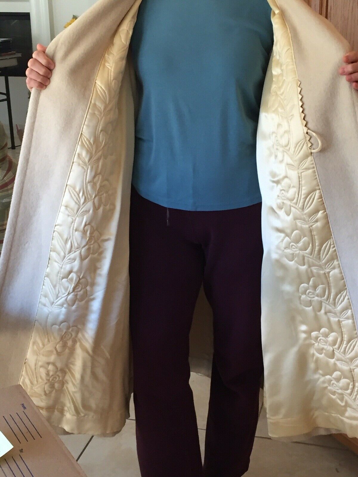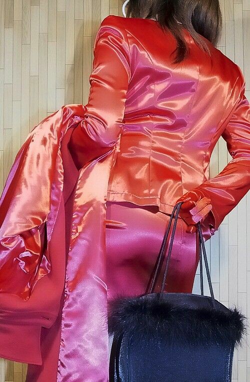 That is the sexiest red satin lined coat I have ever seen. I wish it had a label so I could see the makers name.