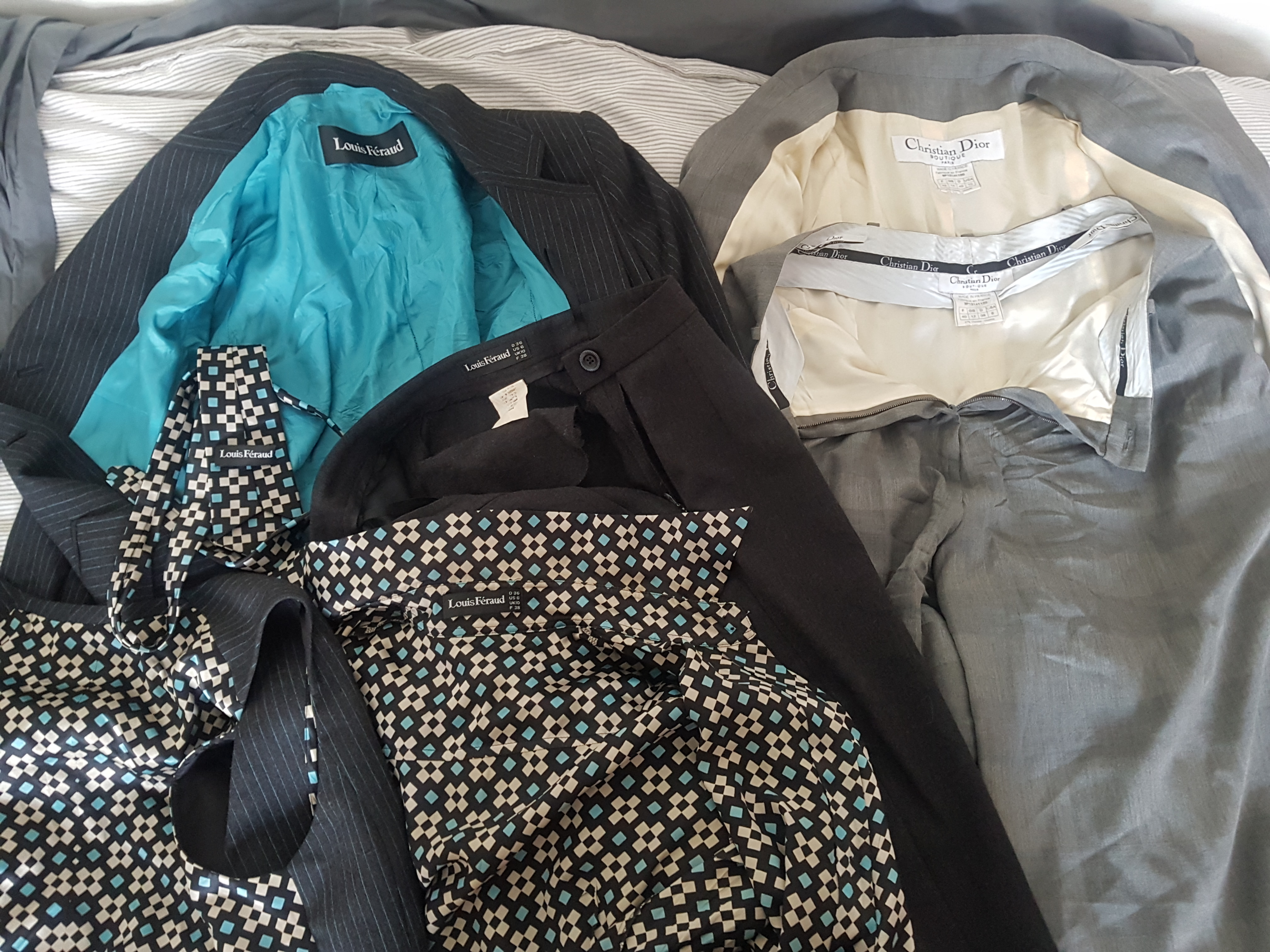 The Louis Feraud would probably be worth about £1,200 or more nowadays. The woman I bought it off said it cost her several hundred back in the 90s early 2000s and it's a whole 4 piece so it's got to be worth loads. Dior don't sell women's suits online as a single item, but buying a jacket and a matching pair of trousers costs £4,300 if I add them both together, so it's probably collectively £5,000-£6,000 worth of clothes there, which I bought for £205.