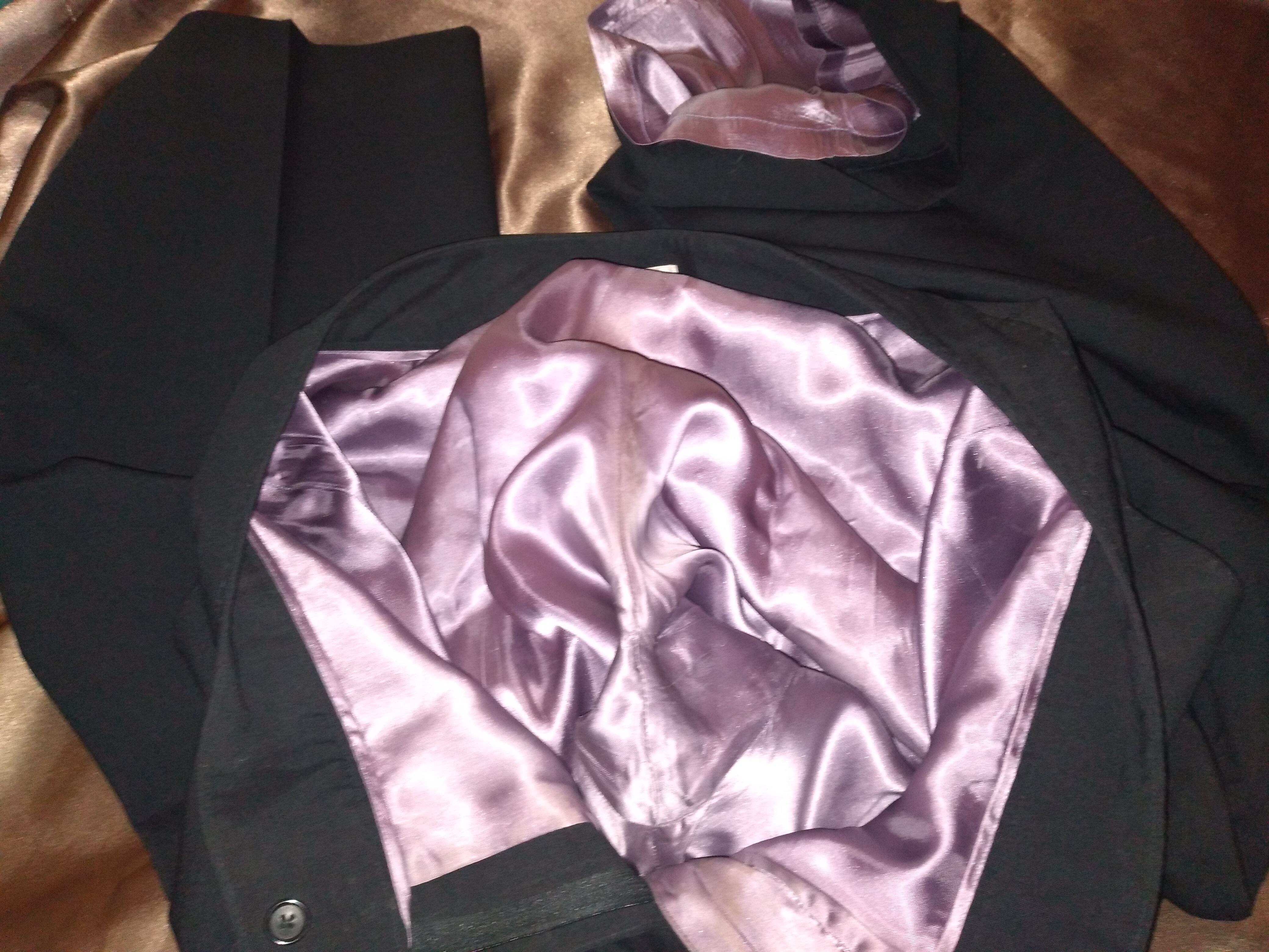 I love wearing a women's suit, i.e. a satin skirt and a satin jacket, but always with a beautiful white retro blouse made of very slippery polyester.