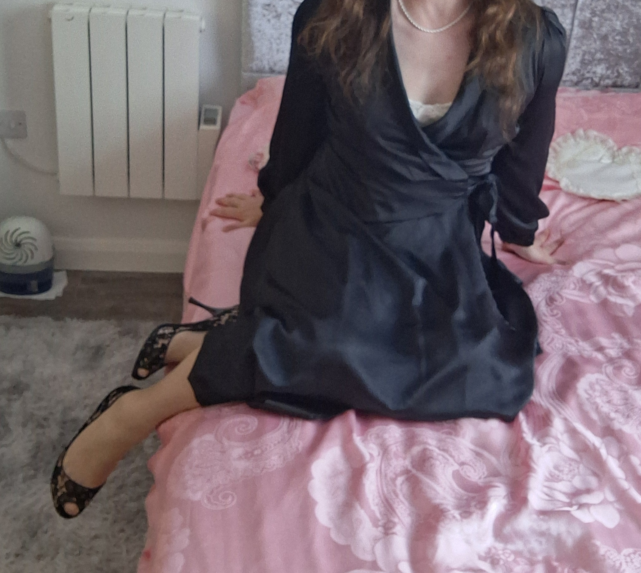 New black silky wrap dress and peep toe heels .....