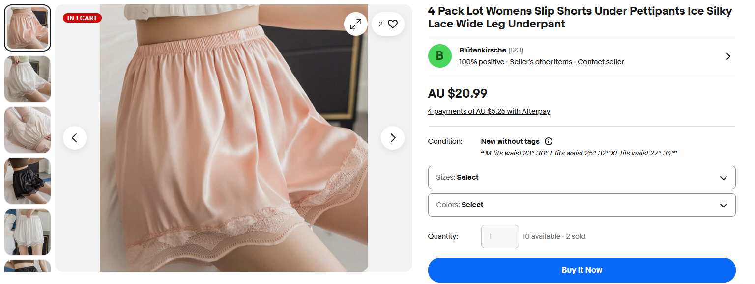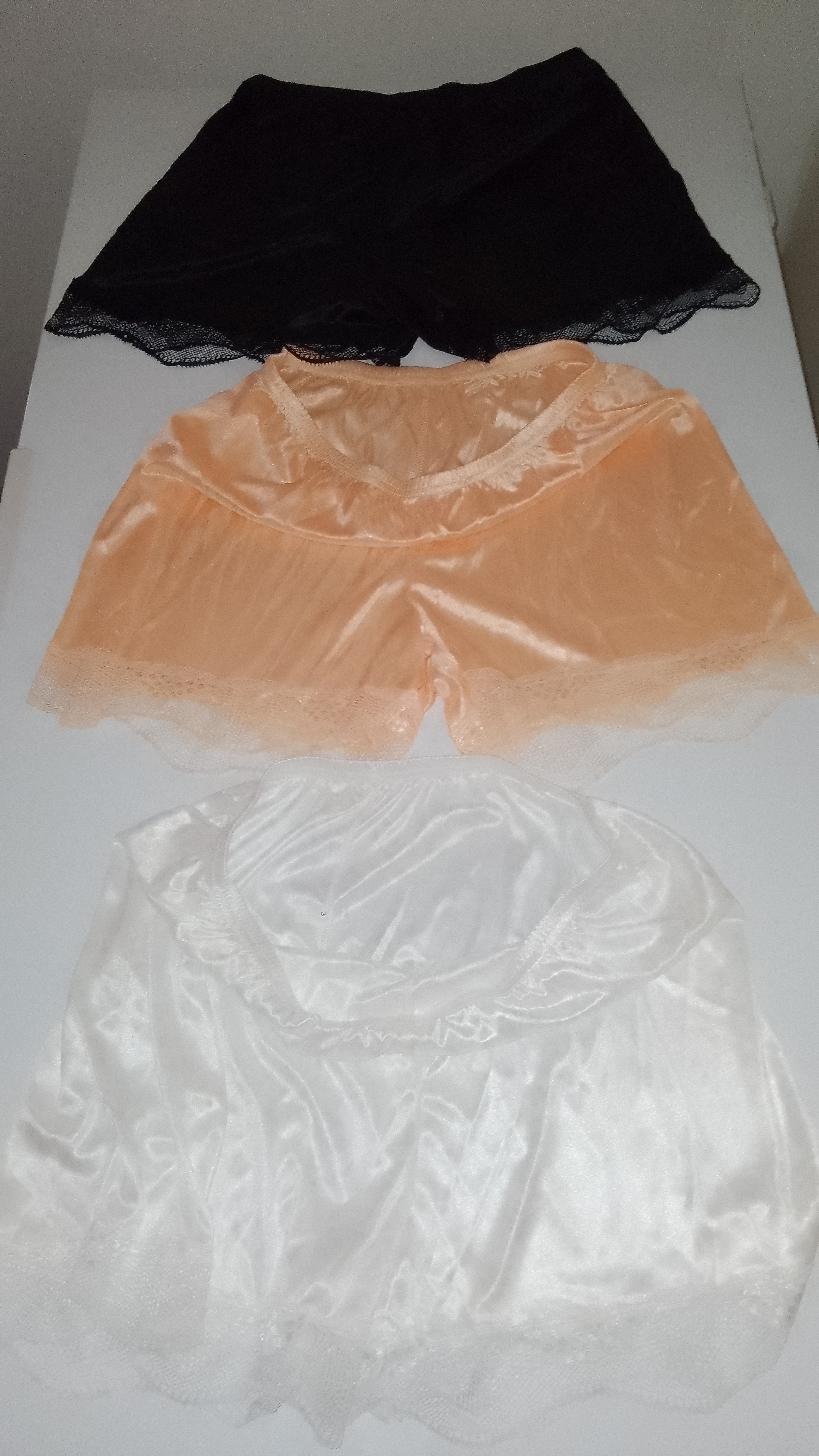 Well guy's my items arrived today, if you buy some or like me the 4 pack and I suggest you do don't buy them from my seller as it took them 10 days to post and only after I contacted them. That aside while no one would say that they are high end quality they feel amazing they are as silky on the inside as they are on the outside, the first pair I tried were worn under an average quality half slip and as most would know there is usually friction if the slip is worn with the silky side out. Not this time the feel when I rubbed my cock was incredible it is years since I have felt something so slippery down below. As I said I do suggest you invest but beware the sizing is very very small I knew this and ordered XL I am average size, so if you are on the larger side you will be disappointed with the fit. Those with an attention to detail will notice only 3 pair in my photo that's because the other pair is in the wash for obvious reasons just like the white pair will be in the morning.