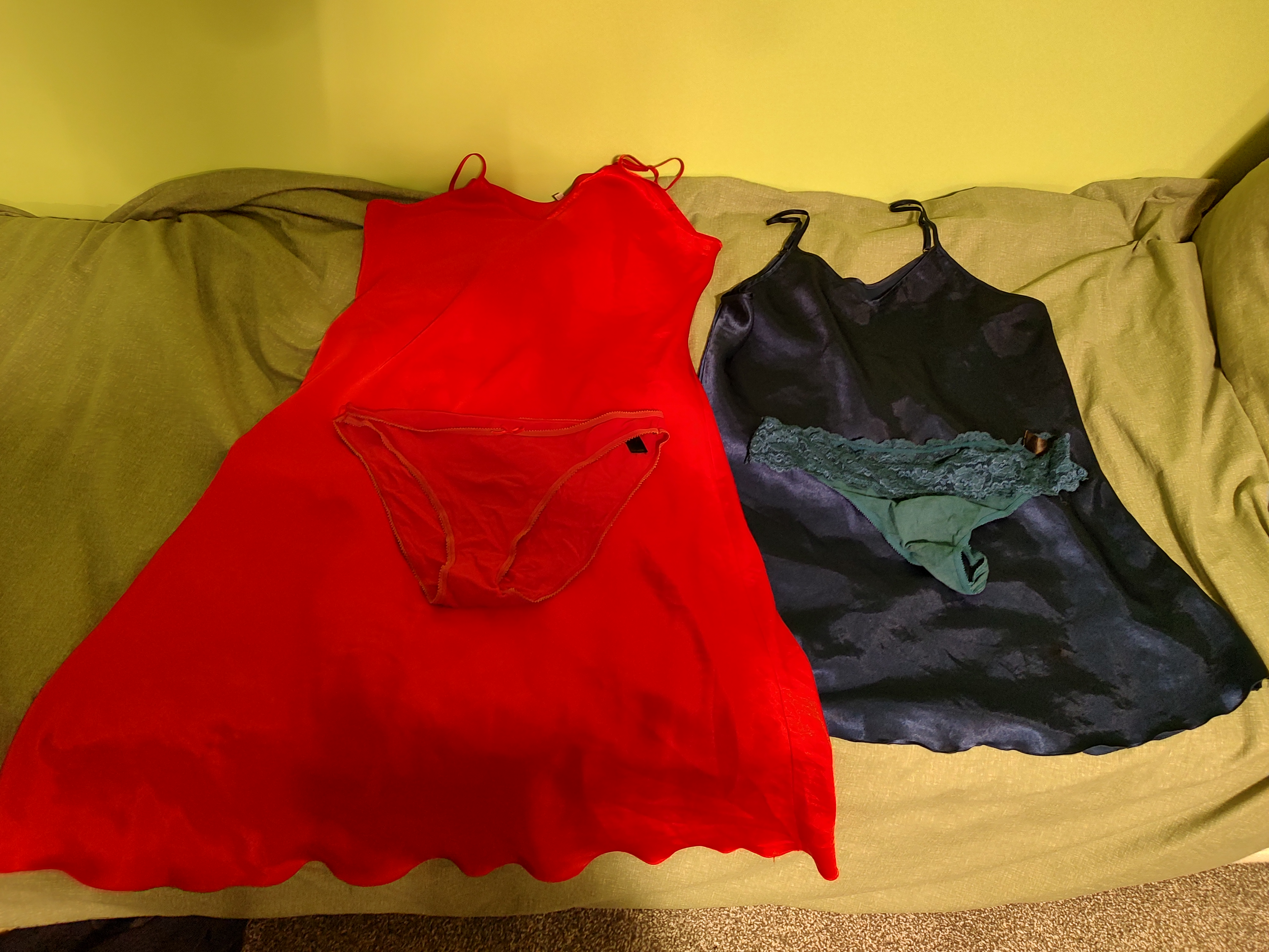 I got these nighties this week from a woman on eBay, which came with "extras" i.e. two pairs of knickers, which although washed had clearly been worn in the past. The blue nightie also had some dried cum stains inside it near the crotch. And if there was any further doubt that she had been fucked while wearing them, when I messaged her to ask about some other items that appeared in the listing pics she replied with: