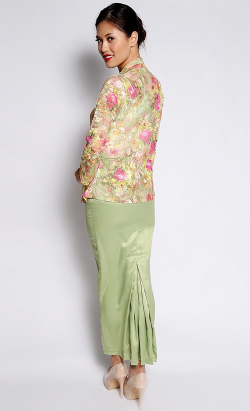 kebaya in malaysia is more 2 split in the middle than pleats behind with the blouse on knee length instead of butt length.
