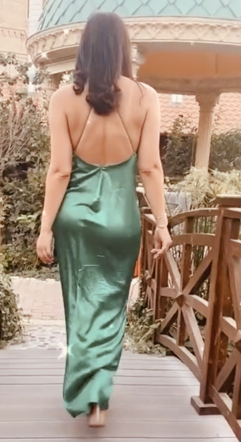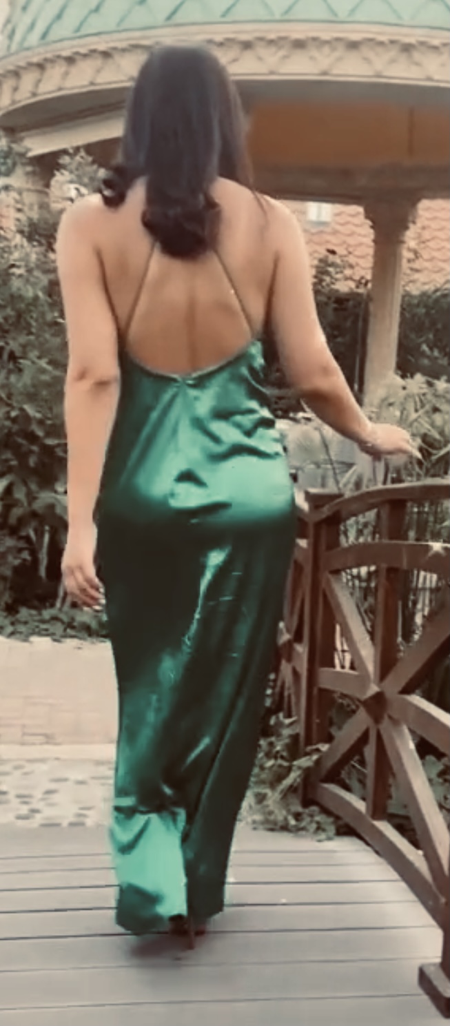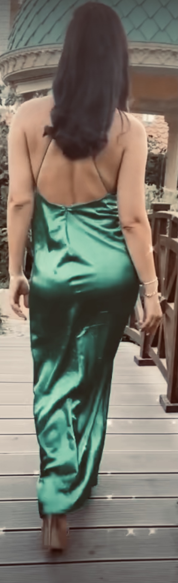 Gorgeus babe in green satin .. just imagine you are walking behind her ..