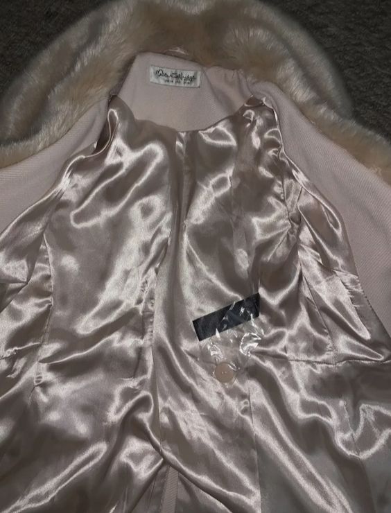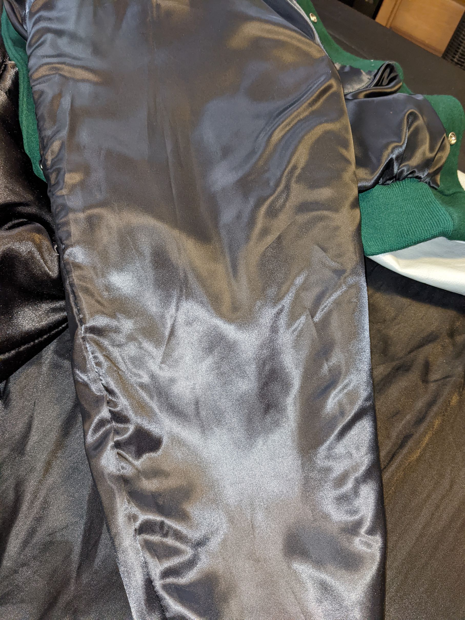 I've always had a thing for lettermen jackets worn by female athletes, especially cheerleaders that have satin linings. Scored this off Ebay a while ago. "Rochelle" was a varsity football and basketball cheerleader based on the lettering, ran track, and cross country. I imagine her beautiful body clad in this heavenly satin lining after cheering at a game. I've fucked it so many times. 100 percent acetate satin. Feels thick and so smooth it slides off your body like a dream. This is one of my favorite coats to fuck. It's no longer this virgin and the satin has many a cum stain from my cock exploding all over it.