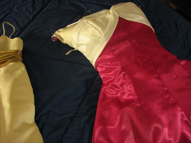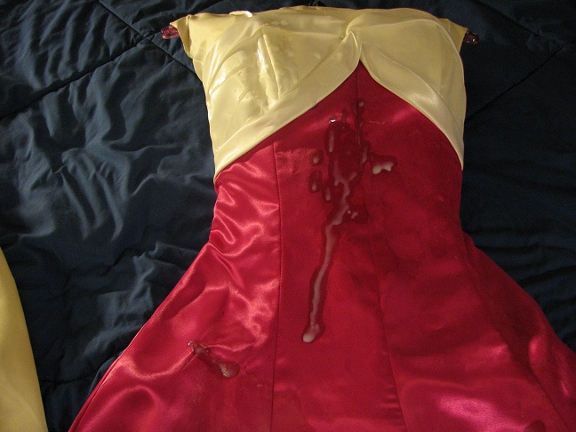 This dress may not be as elegant as those pictured, but it sure is a soft, silky cum rag. This dress was bought brand new by a girl for her prom. For whatever reason, she never wore it. I bought it from her off craigslist for $50 US. When she took it out of the garment bag it was stored in, and I heard the rustle it made, and seen it....I got such a raging hardon, I was sure she would notice !!! All the way home, I kept touching and feeling it imagining how it was gonna feel and look to cum and see my cum on it. Sliding my cock between the overlay and the layers, feeling the silky softness, it wasn't long before I blew a huge load on it !! Even though I have some other cum dresses, this one is my favorite !!! I want to see it CUMpletely covered with cum stains !! What would YOU do to this dress ??!!