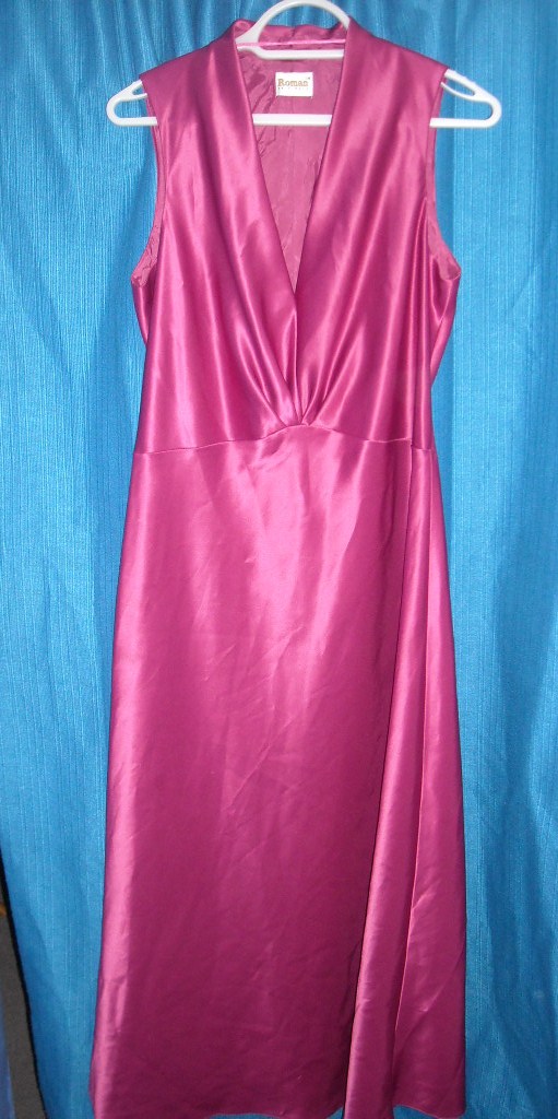 third, a long purple satin gown with rose...