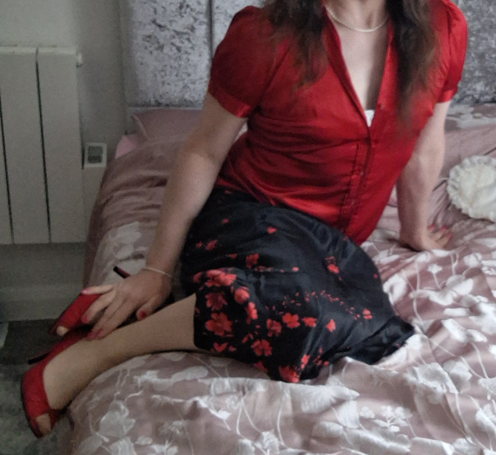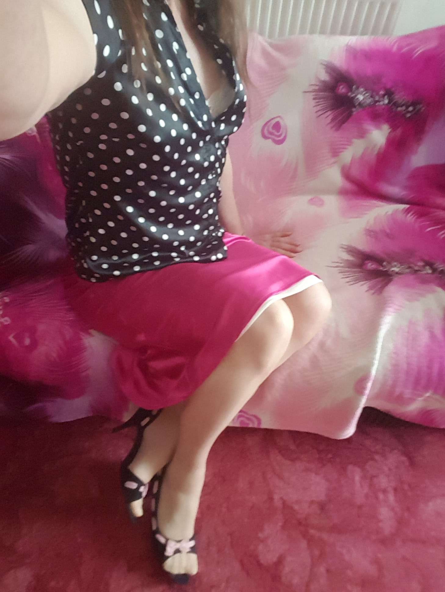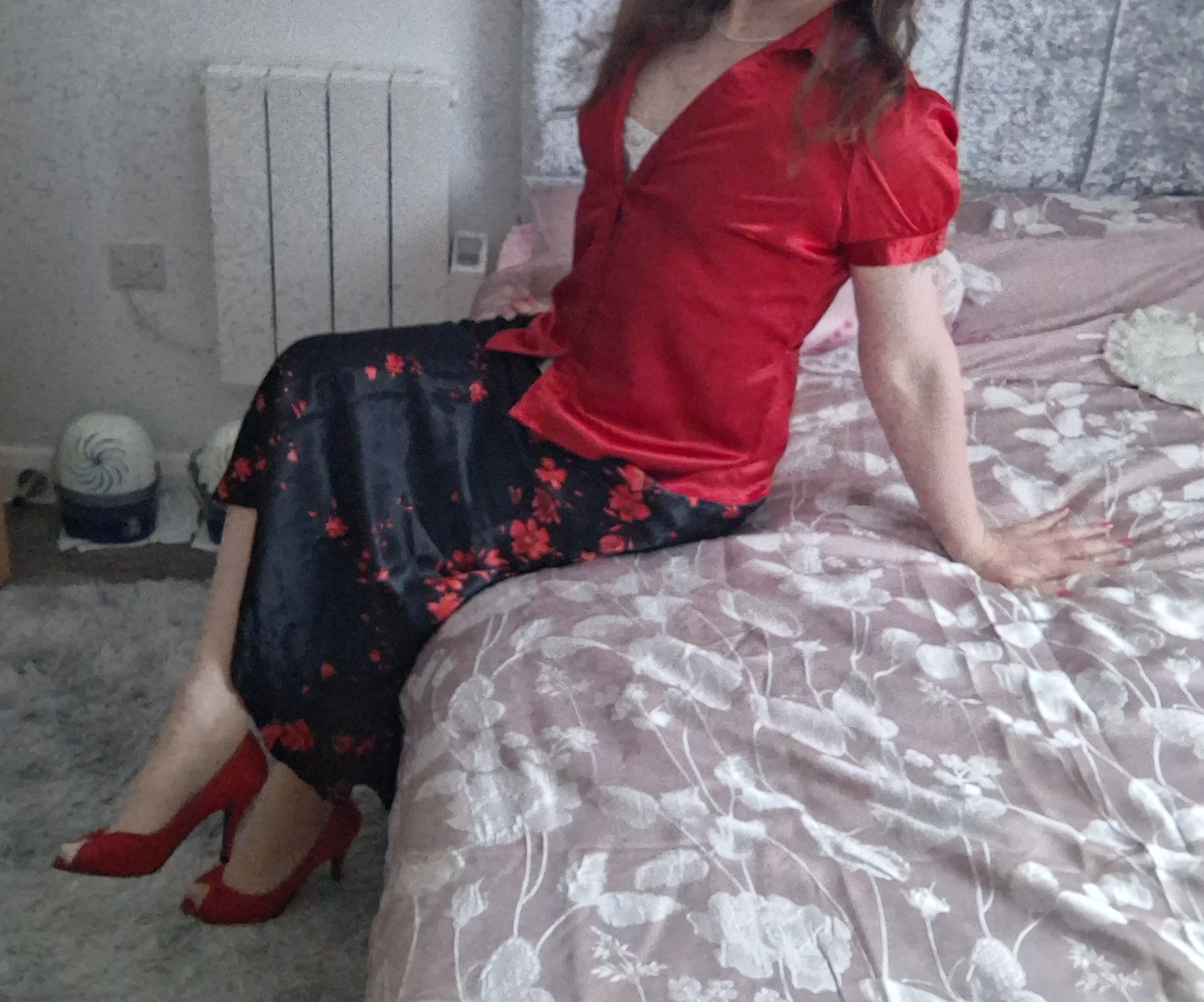 Love this silky shiny outfit the skirt looks so slippy…I imagine it looks even sexier from behind