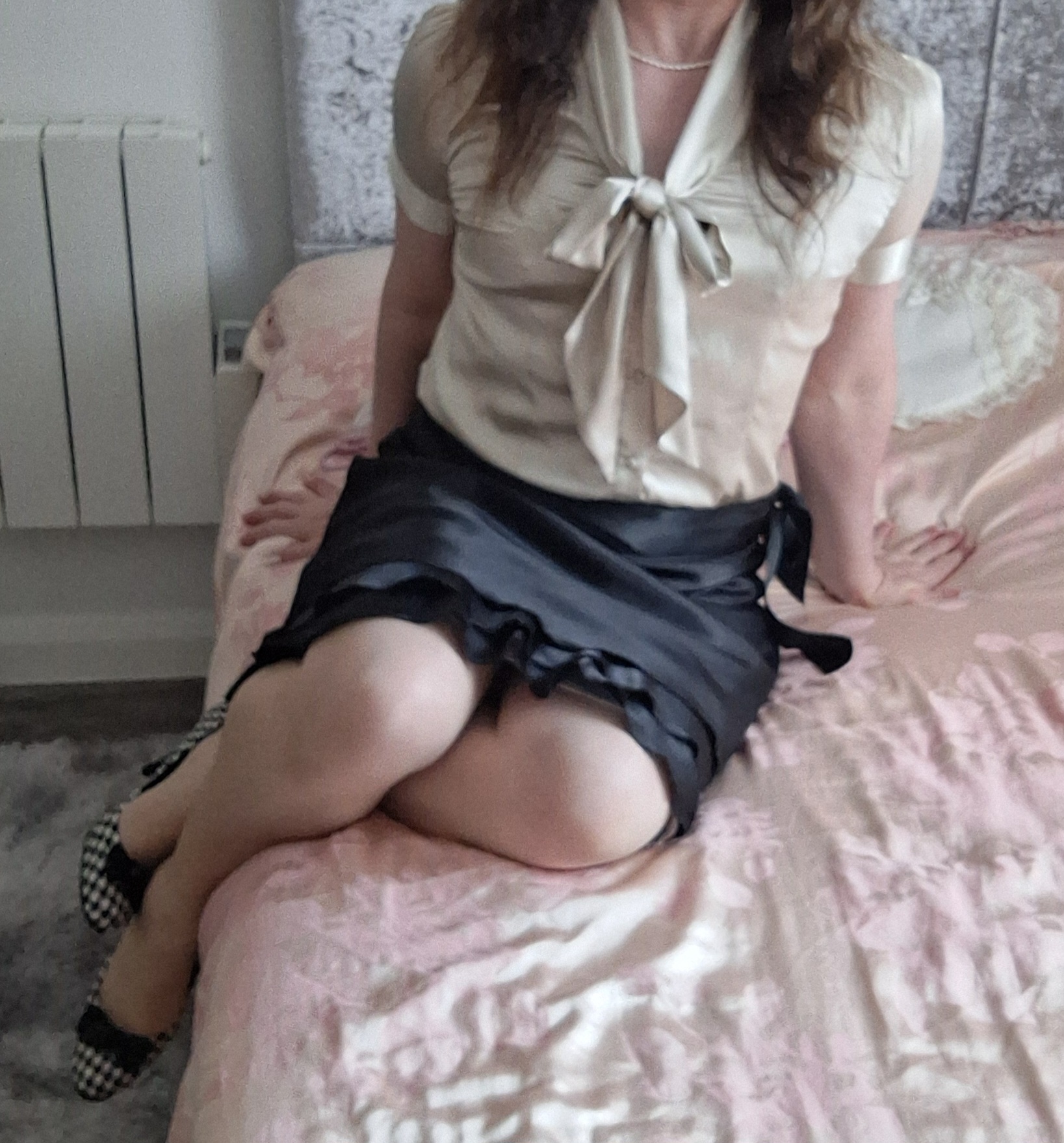 I like whole combo. Idk why, but i find black satin skirts most attractive. And that blouse and heels are so perfect on you.