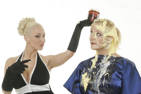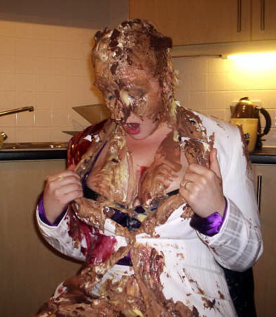 Girl is purple is named Carmen Black. LOVE seeing elegantly dressed women making a big mess on themselves and wrecking their expensive outfits. Doesn't really get any better than that.