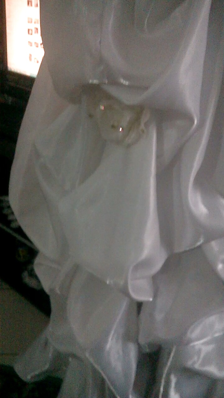 I have had this gown for over a year and have fucked it so many times that I have lost count. It is made from heavy acetate bridal satin and feels so good on my cock. I have several other satin bridal gowns and try to keep this one pristine.