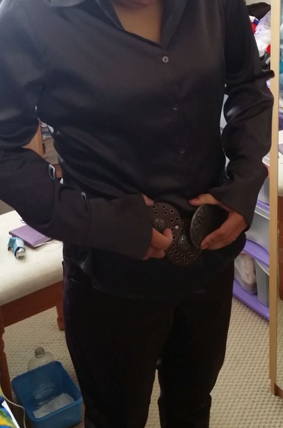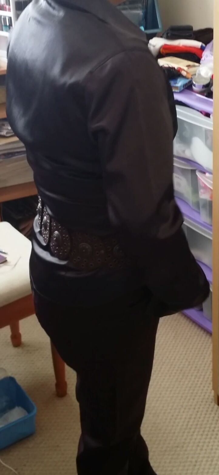 Slipping into her dark brown soft silky smooth satin blouse.. chunky belt and tight dark brown leather pants... adjusting herself.. making herself look just right and so smart in front of the mirror before a teasing milking session..