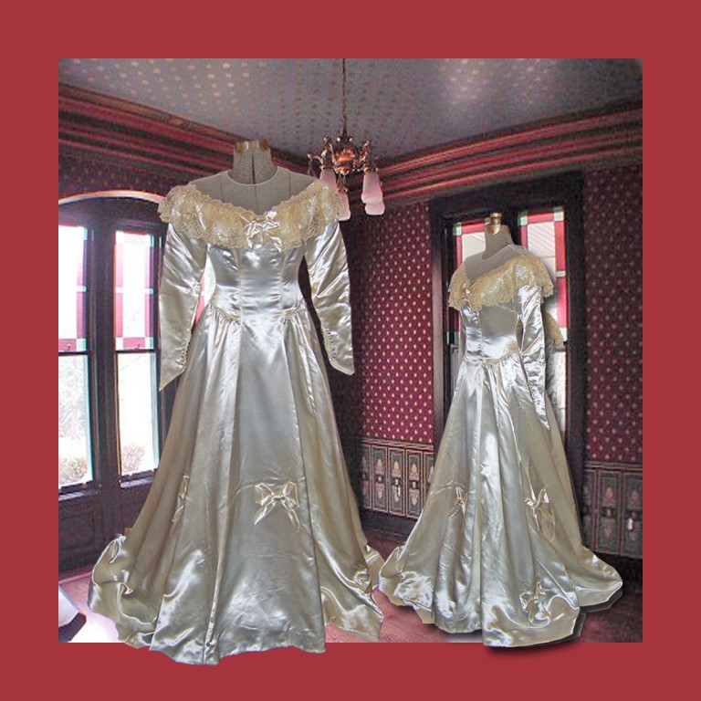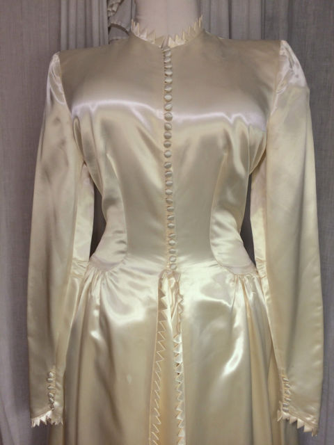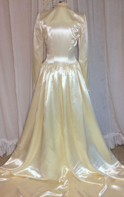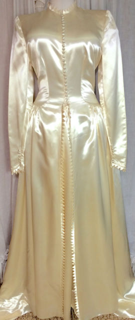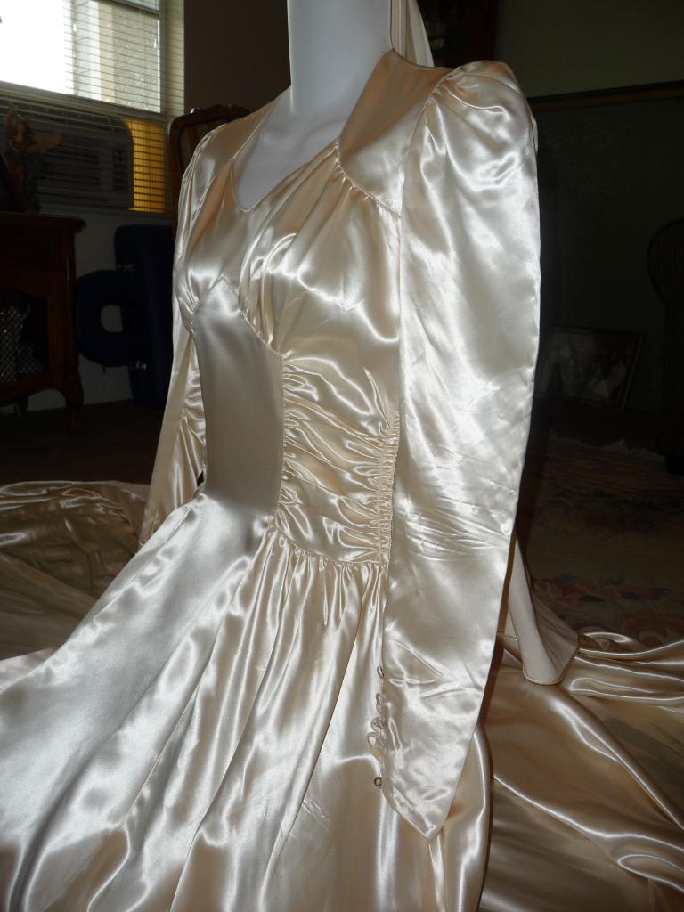 The last gown shown is mine. The others I had bid on on Ebay and didn't win. I have 8 of the forties gowns in my collection and one 2 gowns from the 80' or 90's. the 40's gowns are the best and, but my later model gowns are made of very good heavy acetate bridal satin. By the way I have been a member of Ebay since their start up and have thousands of pictures of satin gowns and satin lined coats.