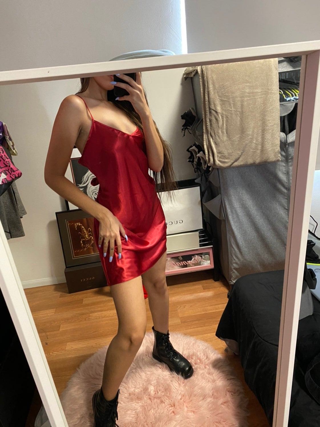 So I found a listing where a sexy girl was selling a “Slip Dress”. Now, it was of course just a Gillian & O’Malley satin nighty that she must’ve repurposed for her nights out, but once she posted pictures of herself wearing it, I couldn’t resist. Had to have it. It looks very similar to the one Rita is wearing. Pics below!