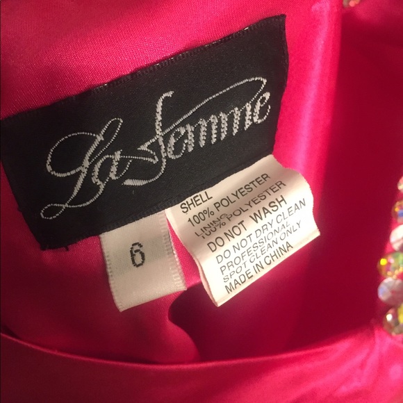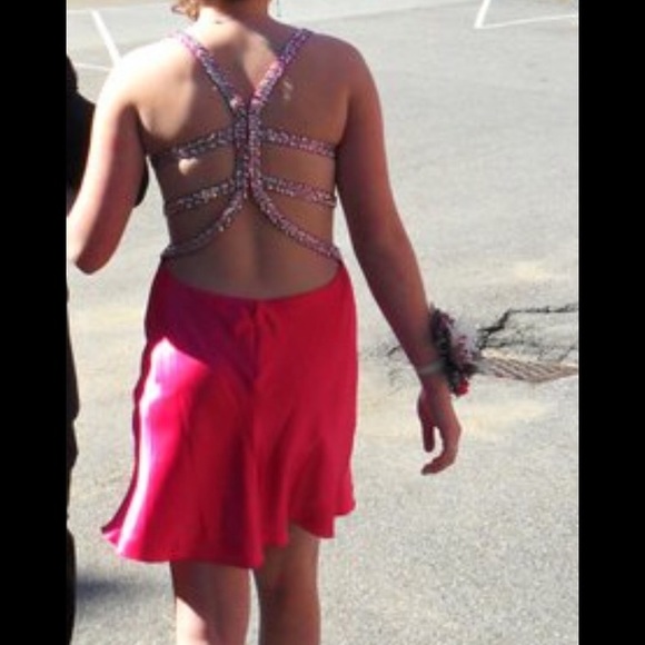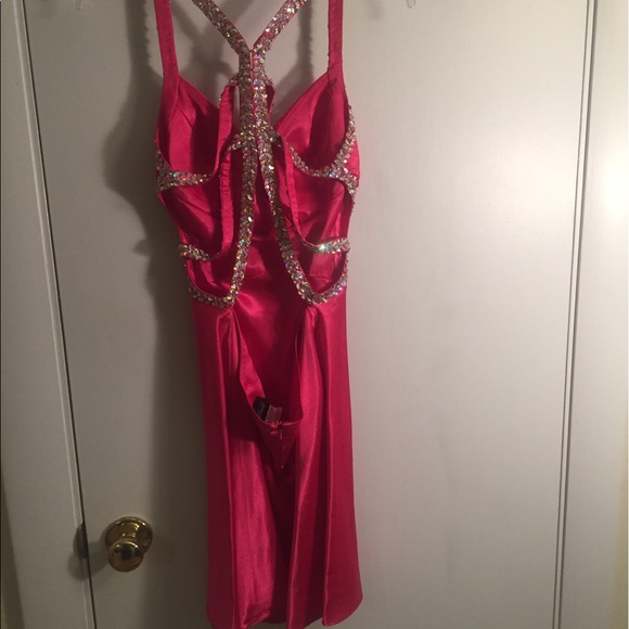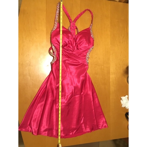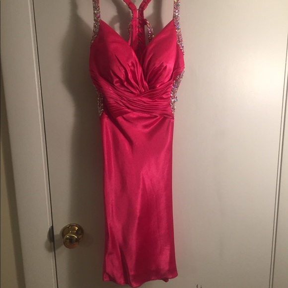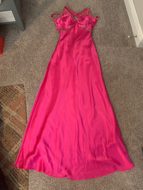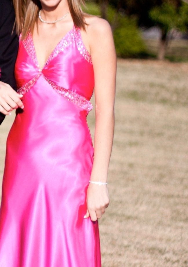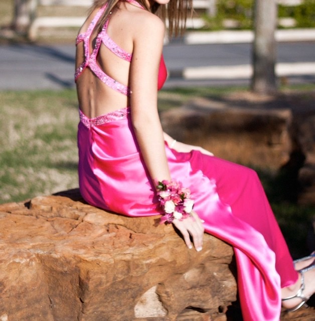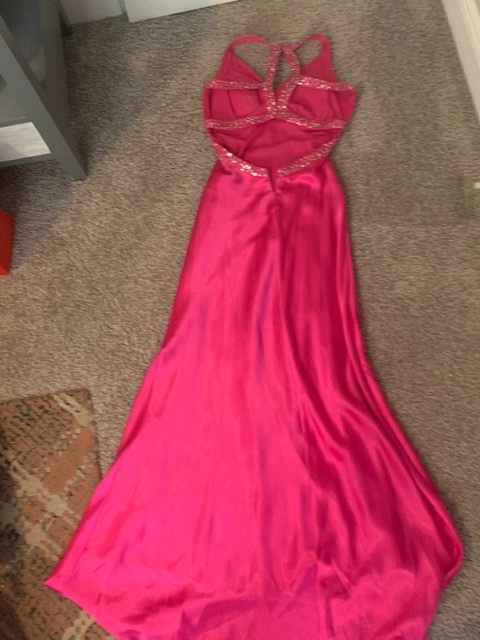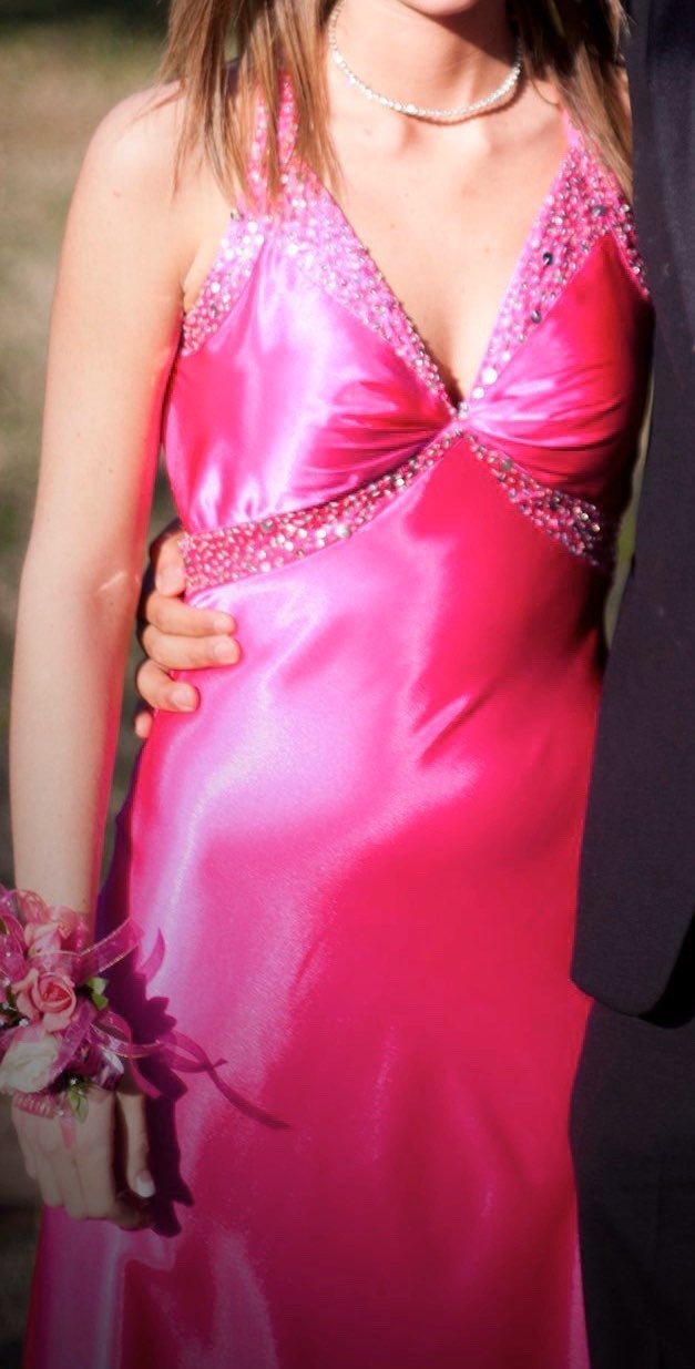 This next dress is unique. The girl took her full-length hot pink satin prom dress and had it shortened for her prom. I would have preferred that it was full-length, but the price was right. Hot pink satin inside & out!
