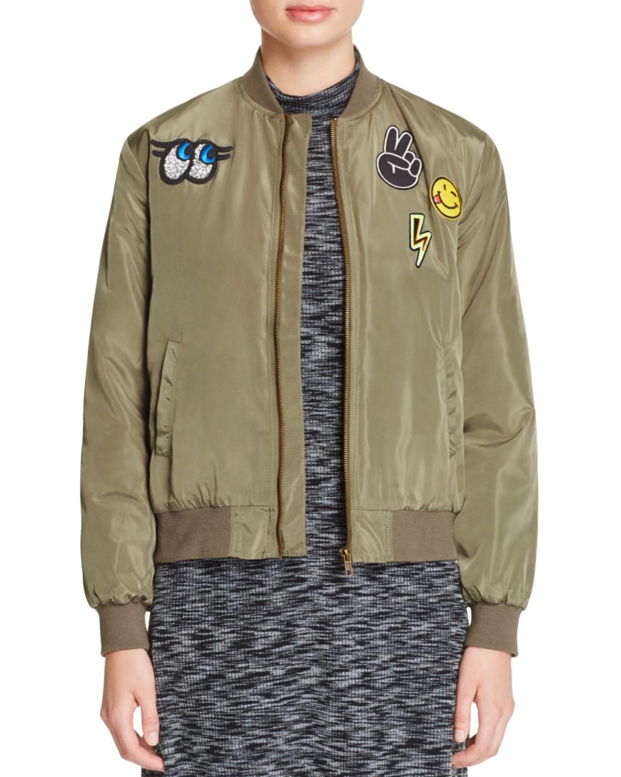 I saw a girl at the airport wearing a green satin jacket yesterday. It had some logos on it....one appeared to be like a lightning bolt or something. Trying to find it.