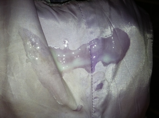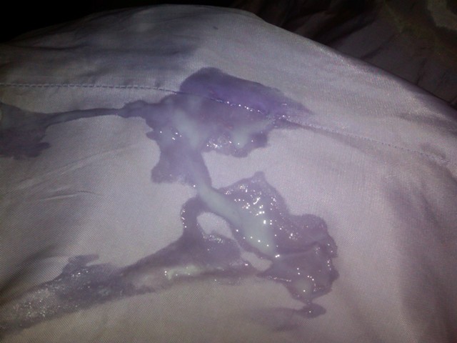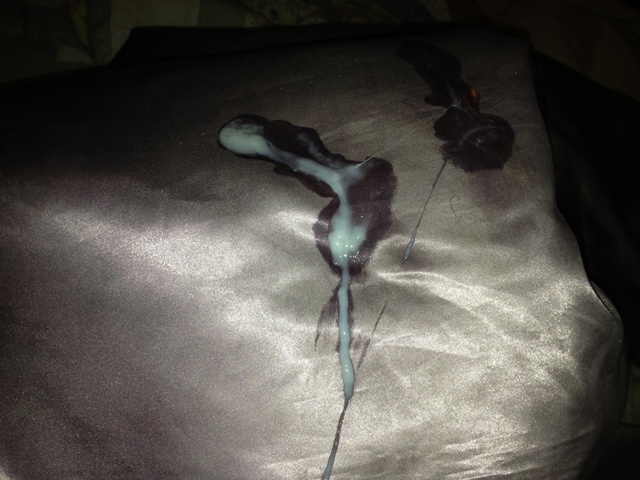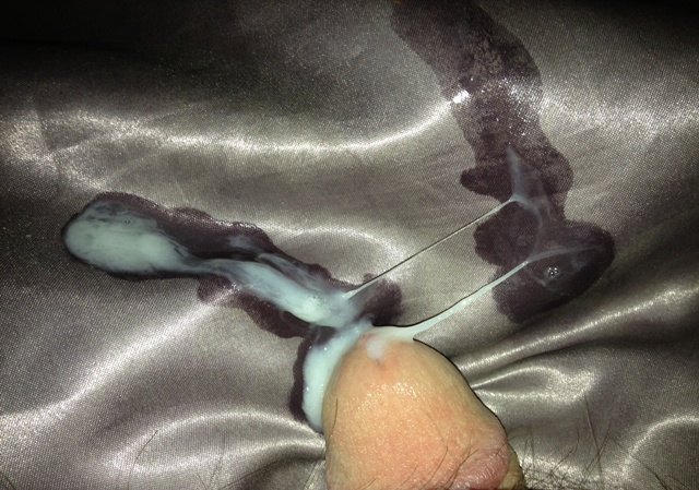 This plum/silver satin wrap came from an ex girlfriend's bridesmaid's dress. I wish I could have snagged the dress, aside from the fact that it turned me on to see her in it, this silky satin has so many of my cockstains on it, I had to add a couple more tonight! Fresh loads baby!