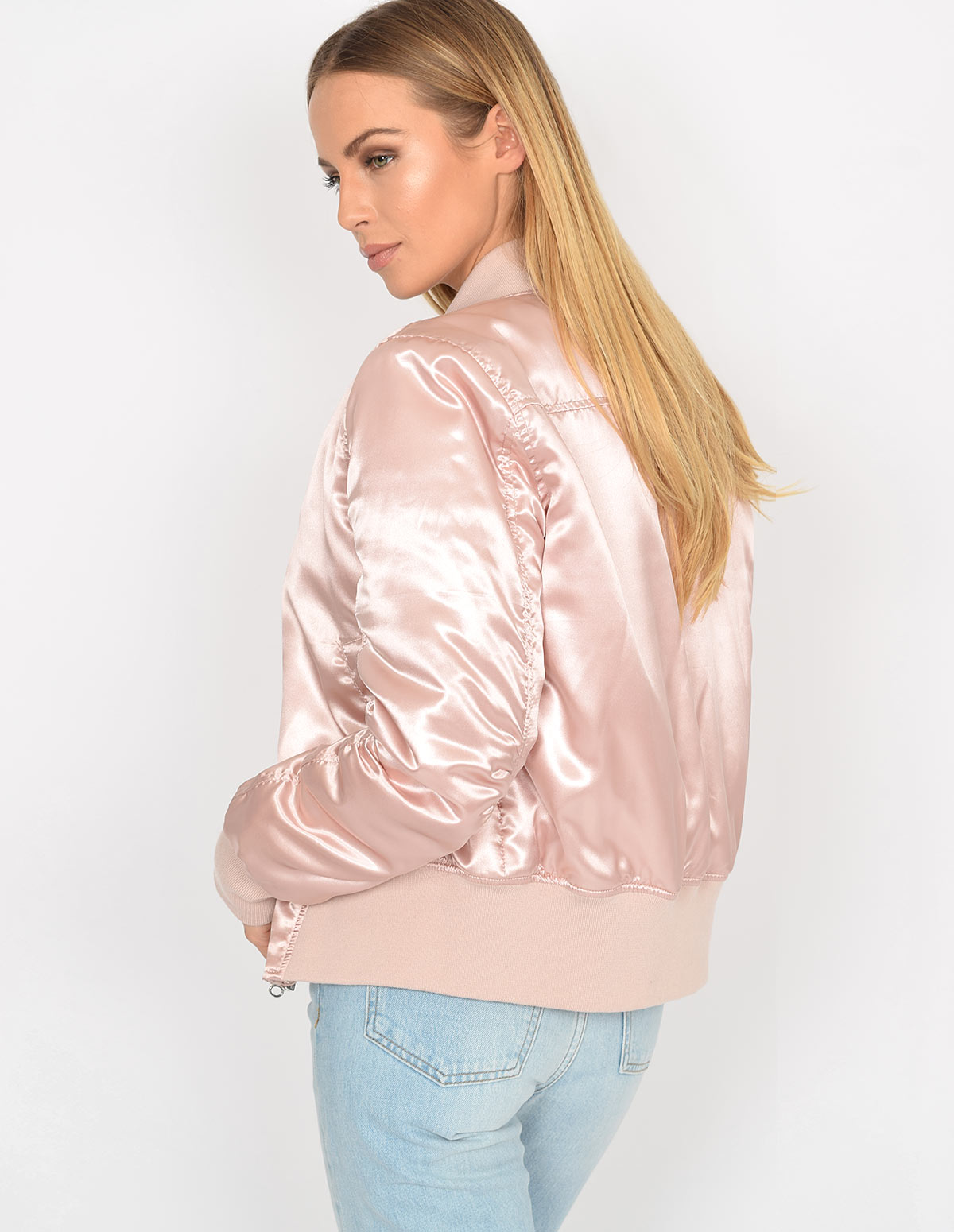 In the absence of any public pics of women in bomber jackets, here's a video from a youtuber who has a bunch of satin bomber jackets on her channel: