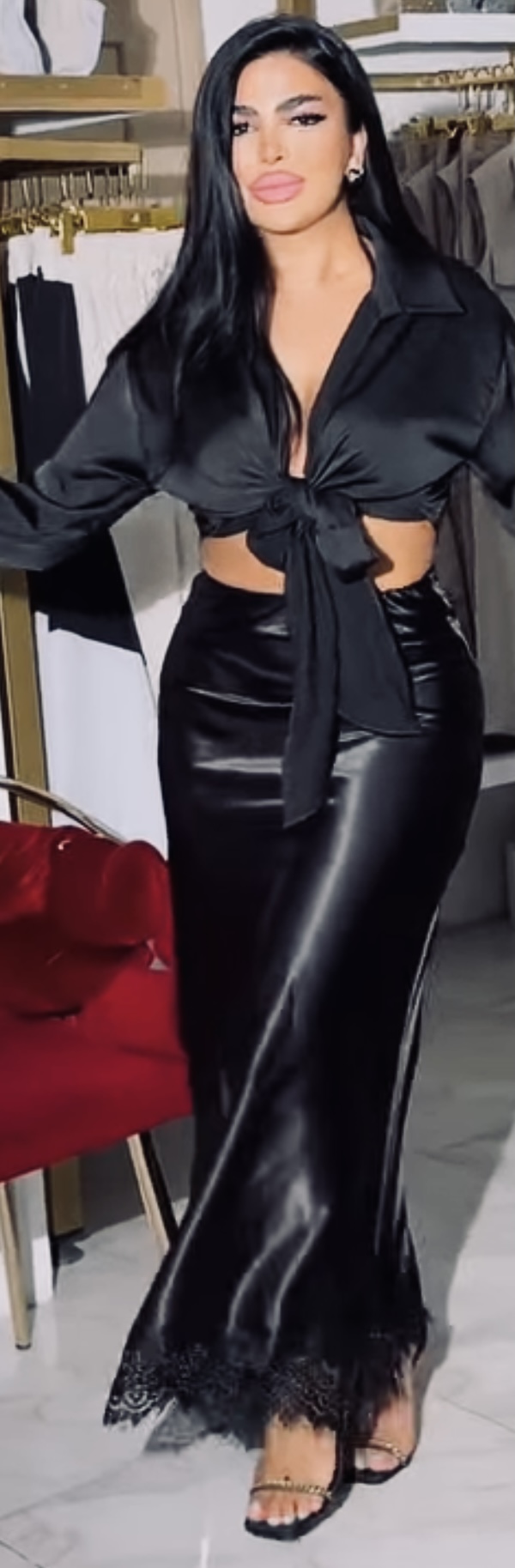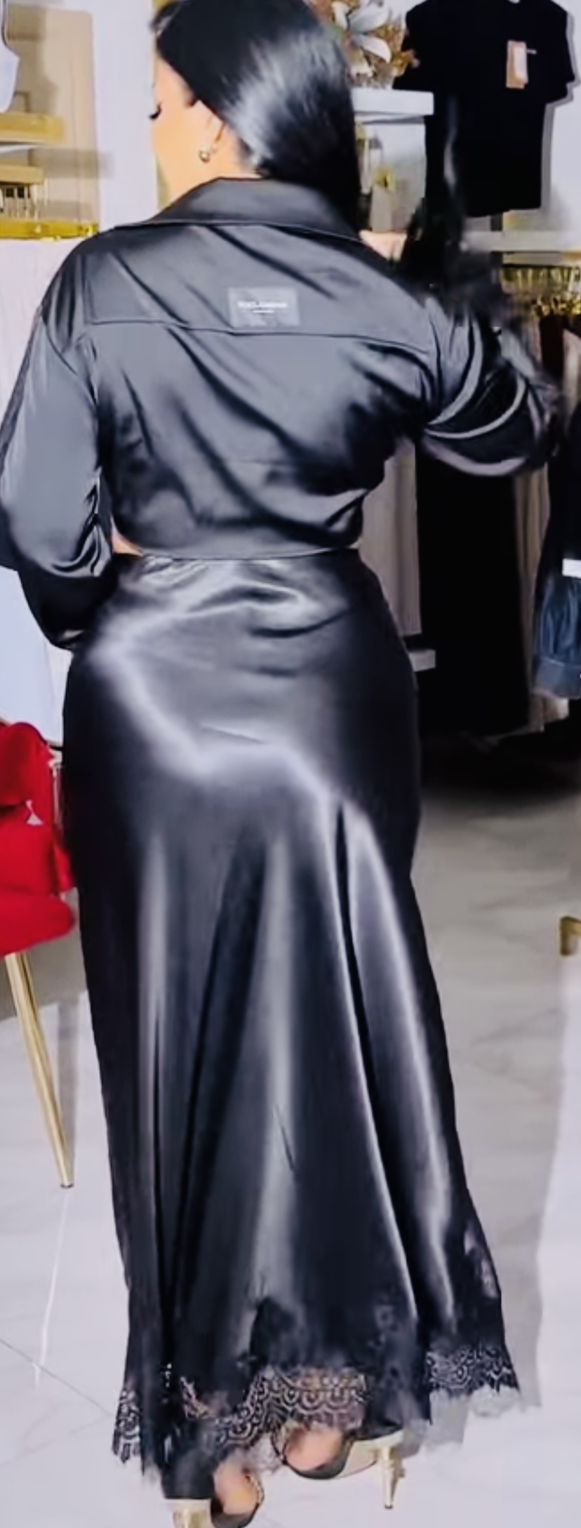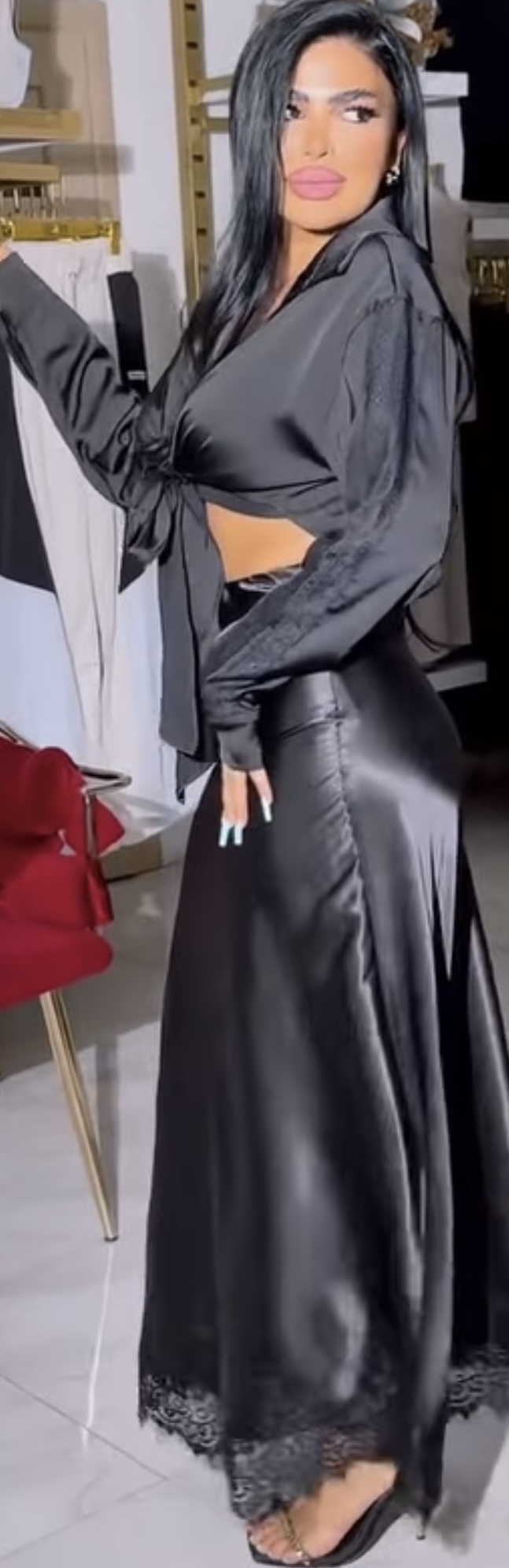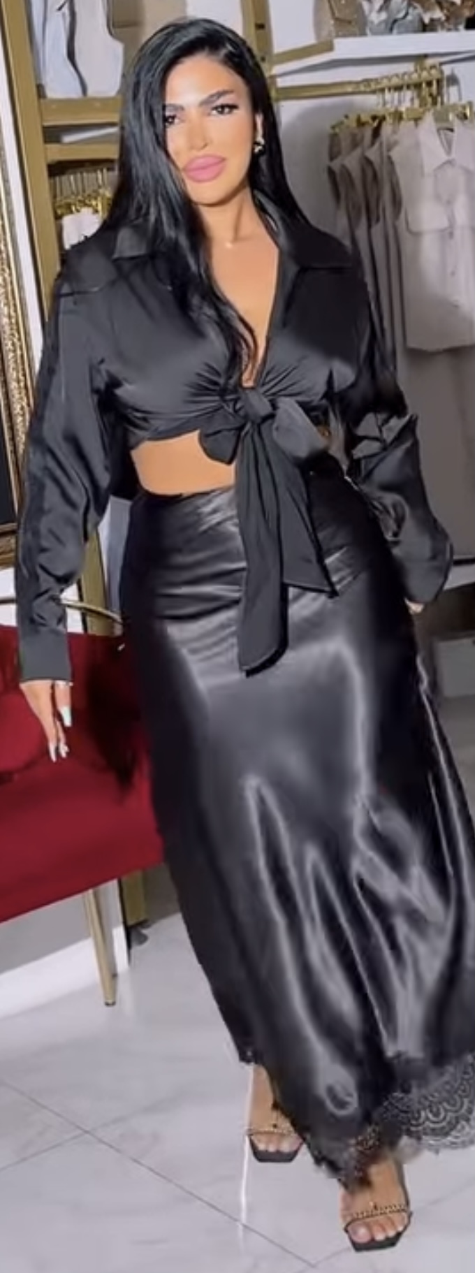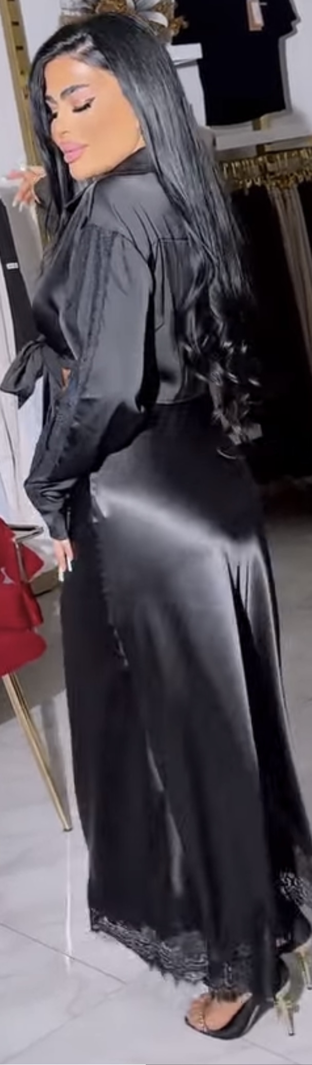 Just feel her satin skirt
