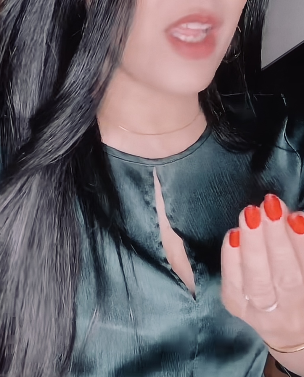 Green satin red lipsstick & red nail polish