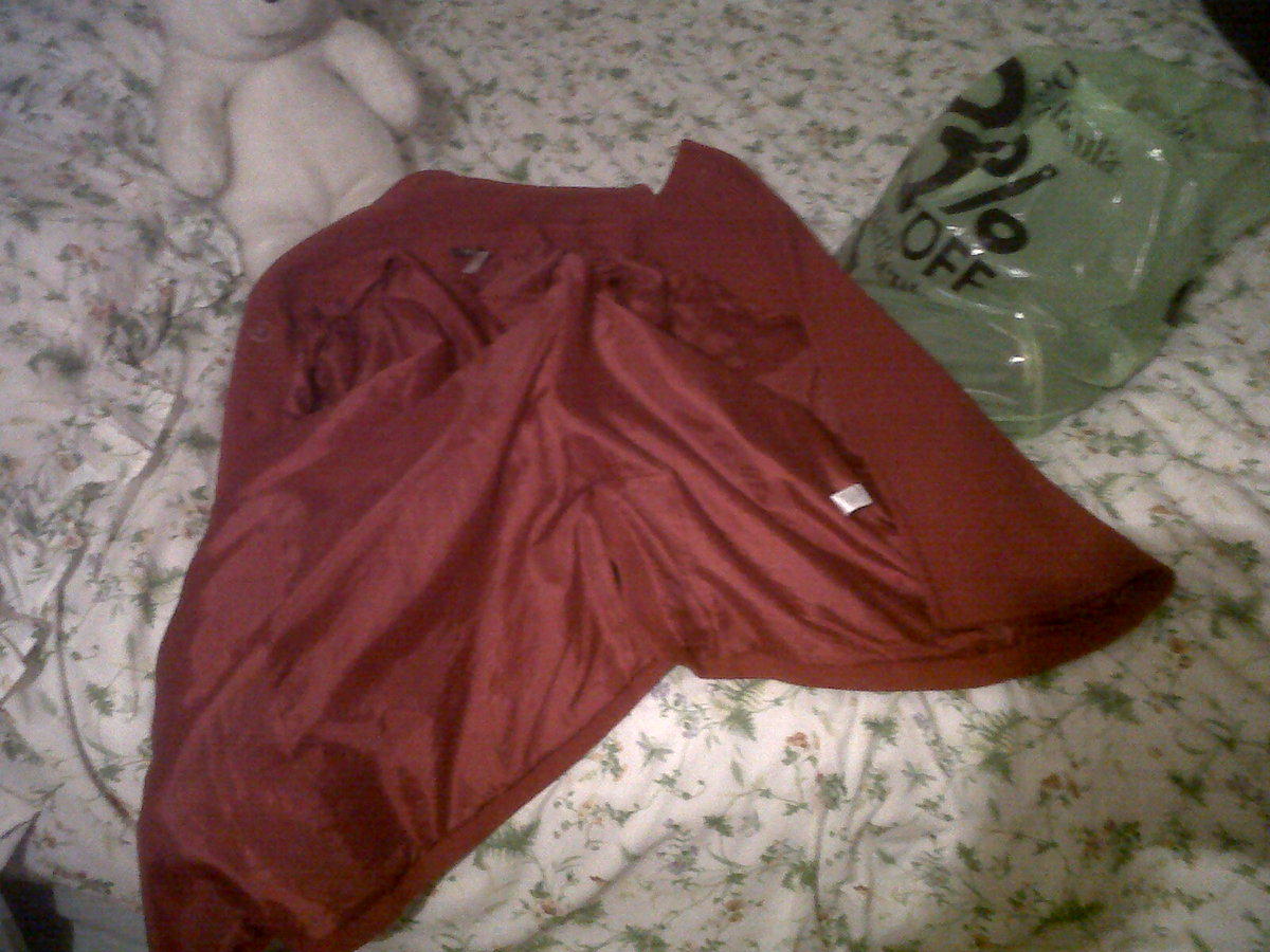 My friends girlfriends jacket which i enjoyed this morning and left a little stain on the sleeve lining. That blue satin did feel amazing!