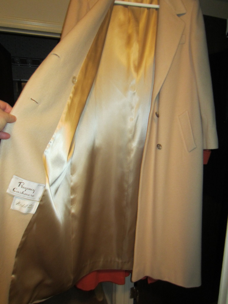 The mailman just delivered the new cashmere coat that I won on Ebay. Got it for only 25 dollars a steal. Since is a cashmere coat by maker Regency, only sold at high-end stores. It still has the tag on it. This coat probably sold for over 5 or 6 hundred dollars. She is a virgin now, but not for long.