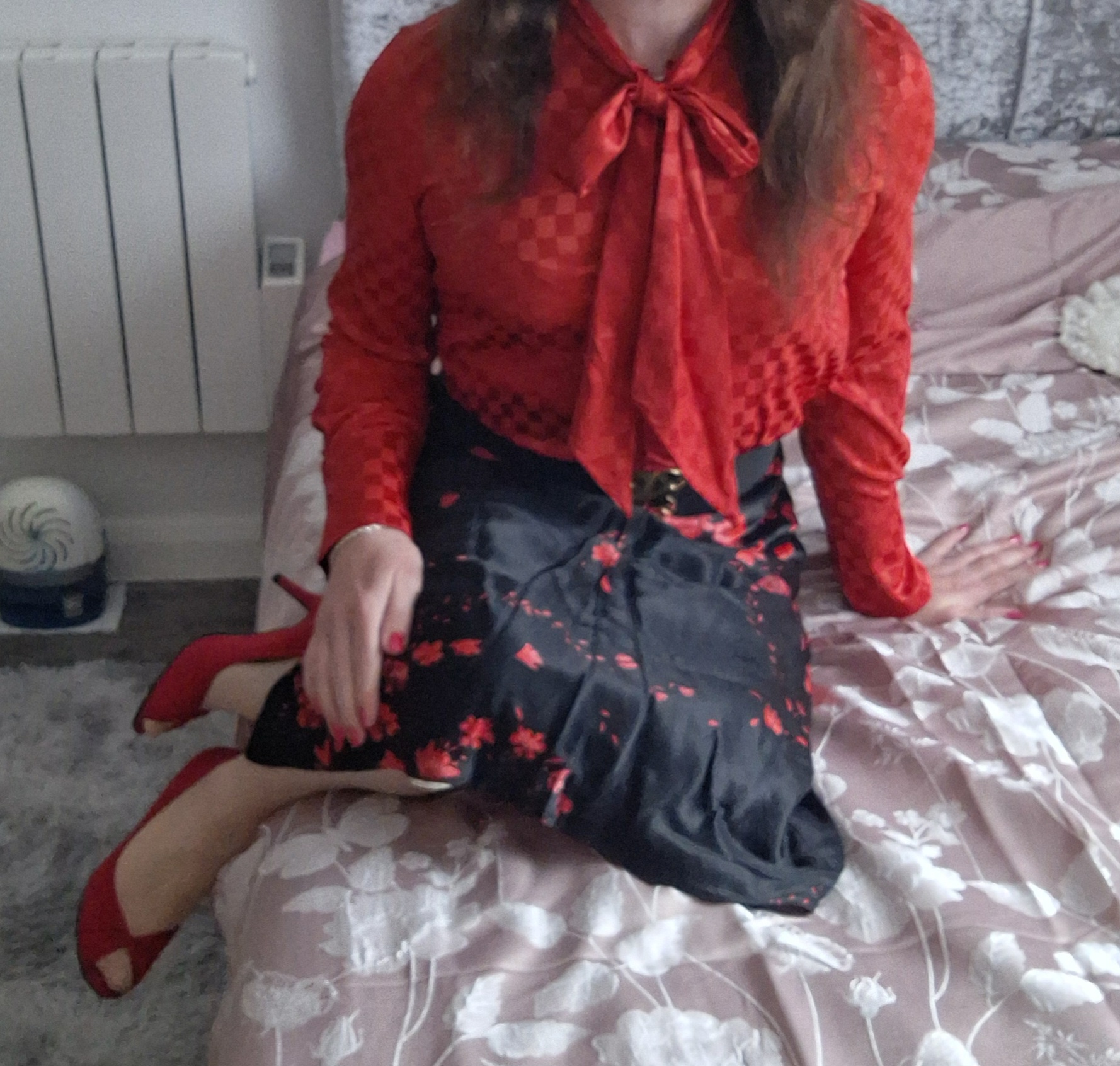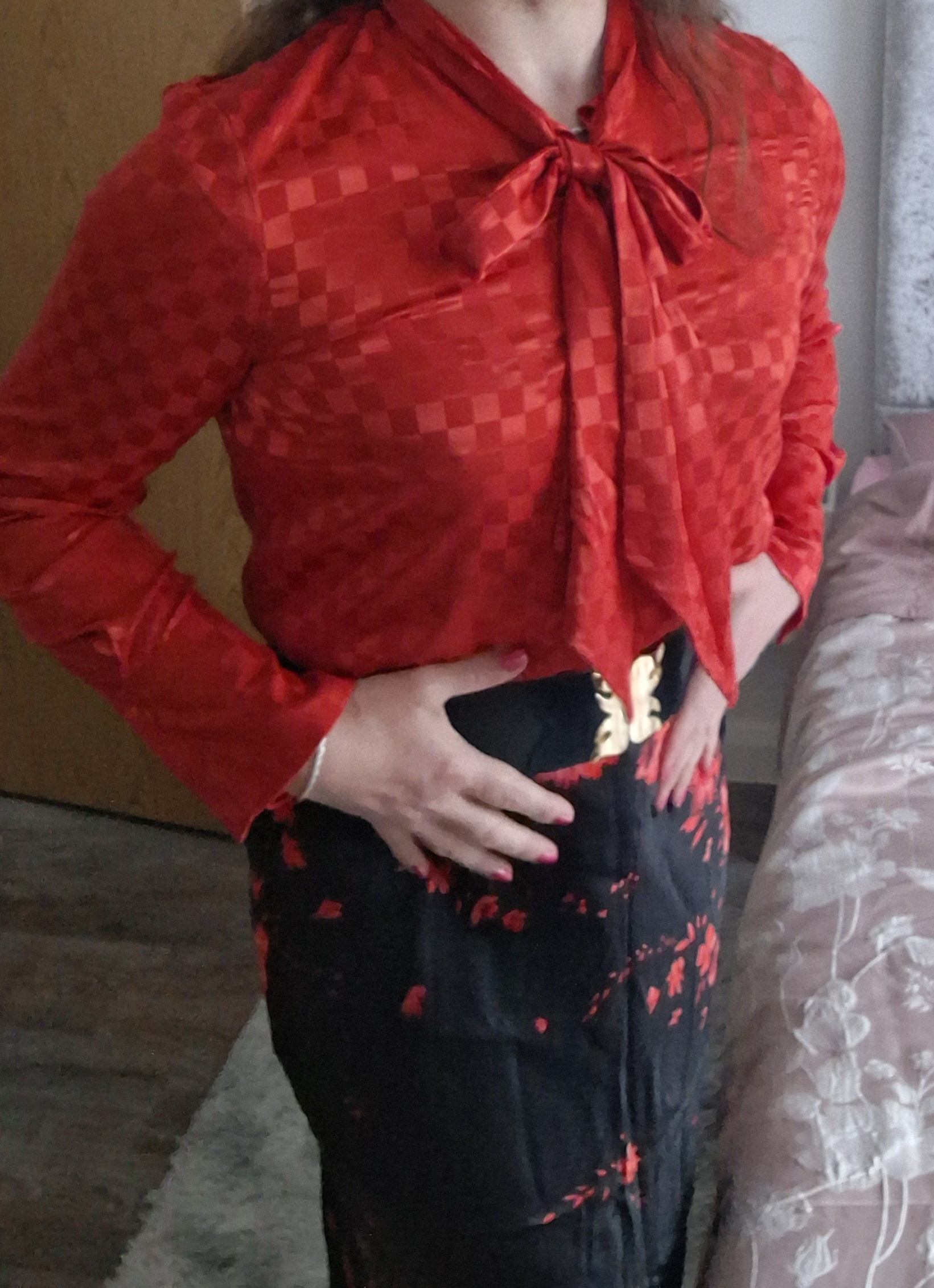 Red pussy bow blouse. So comfy .....