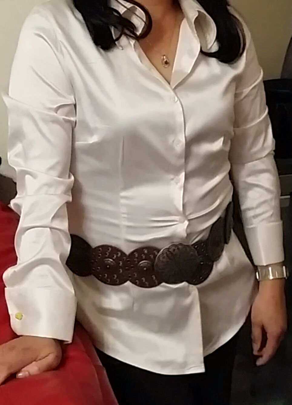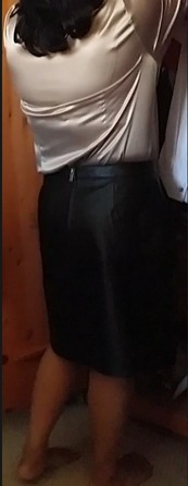 Couple of my good lady in her white satin blouse, chunky belt and tight brown leather pants....