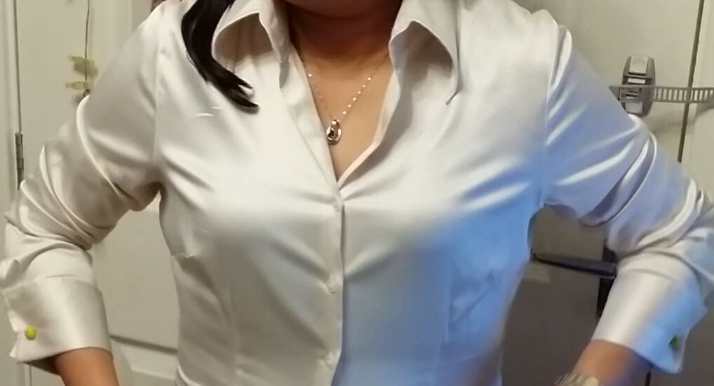 My good lady adjusting herself.. such a shiny tight satin blouse...