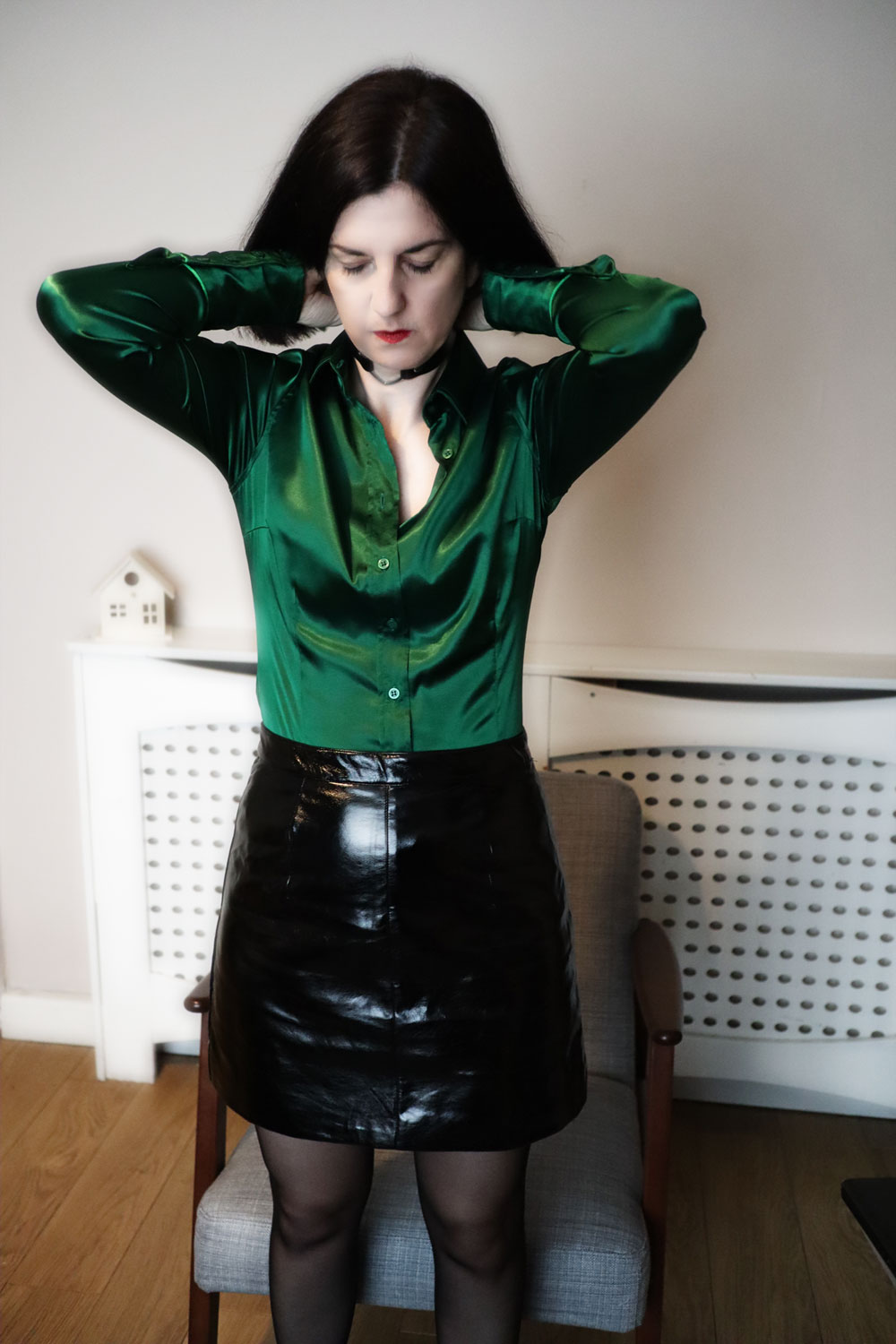 So I’ve bought this green satin blousehttps://drive.google.com/file/d/1bVAju1uqEWPIsmCPaybsX7GDAuxqYu0Y/view?usp=drivesdk for my Mrs to wear with her leather skirt,stockings and heels with a quarter cup bra so her nipples will poke through.