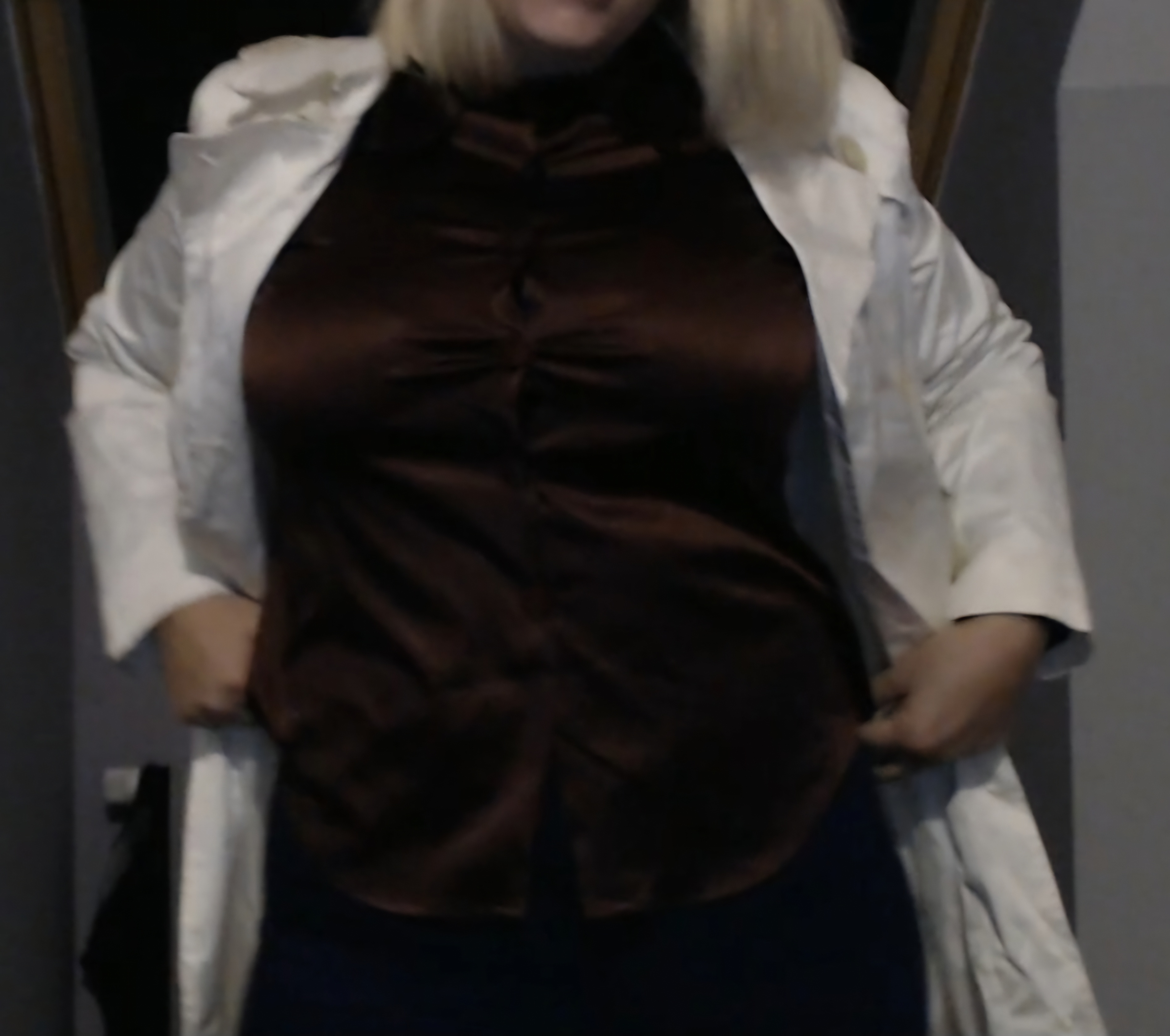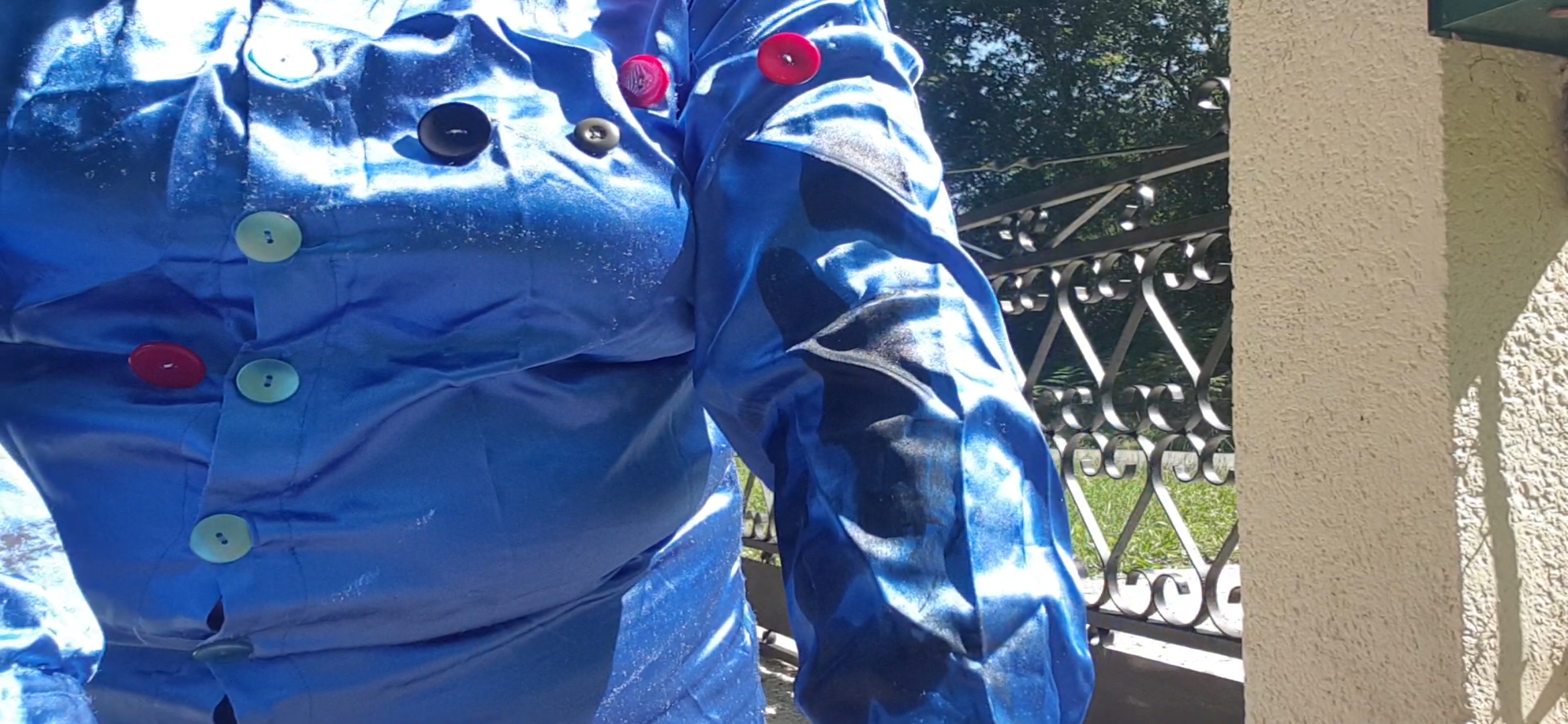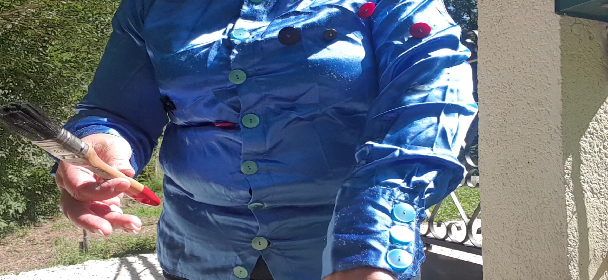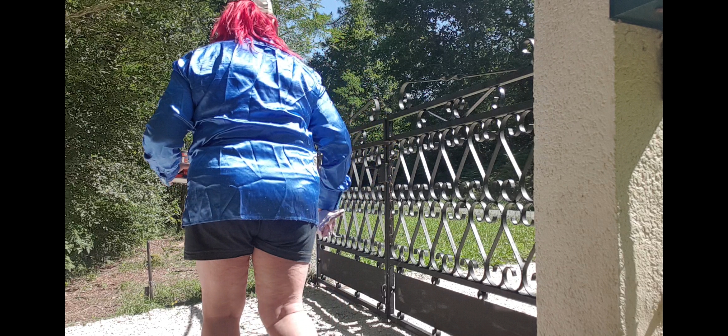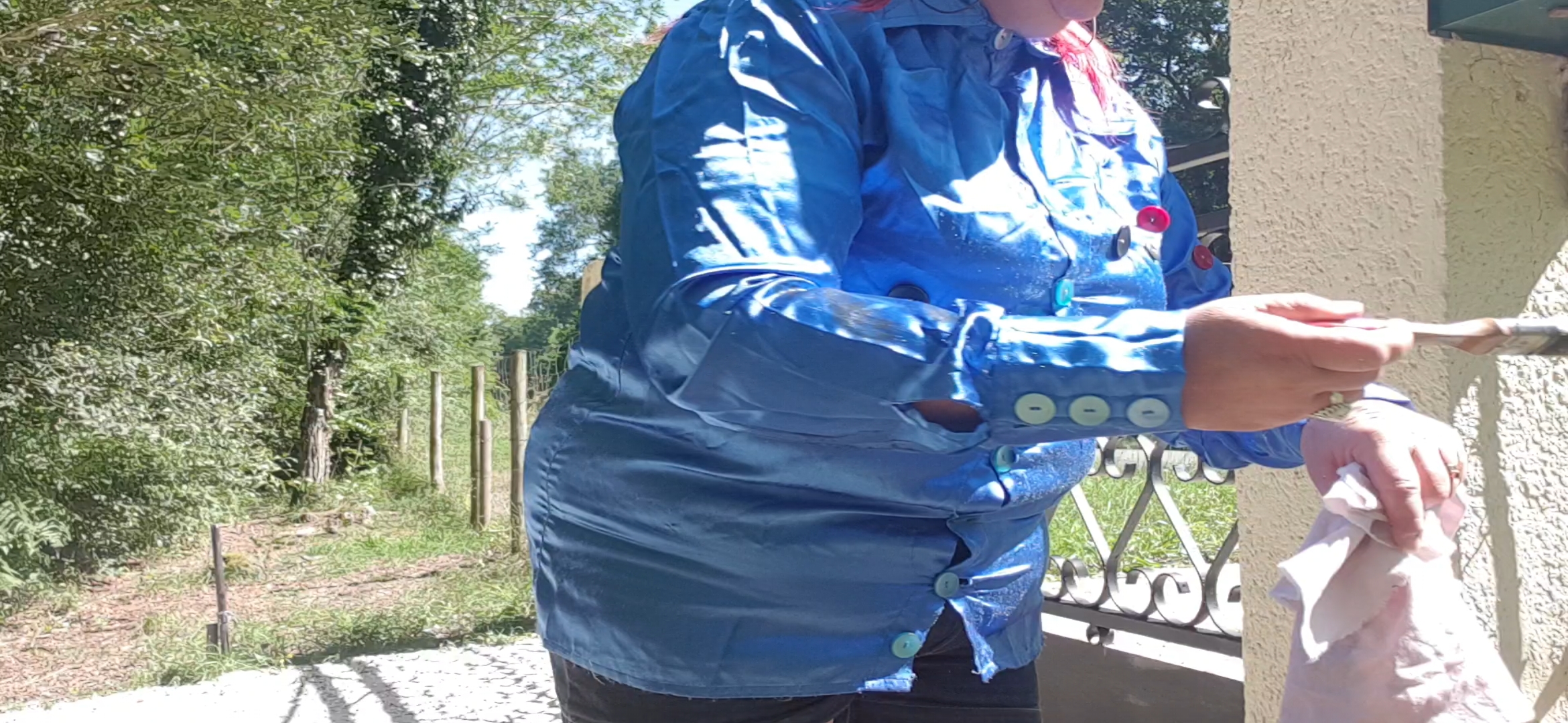 Ma belle mère qui repeinds son portail avec sa chemise bleu satin customise avec des boutons, très excitante