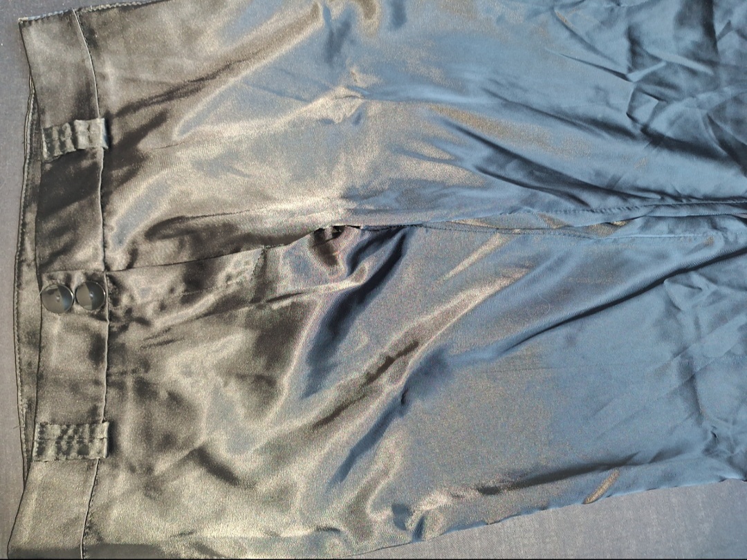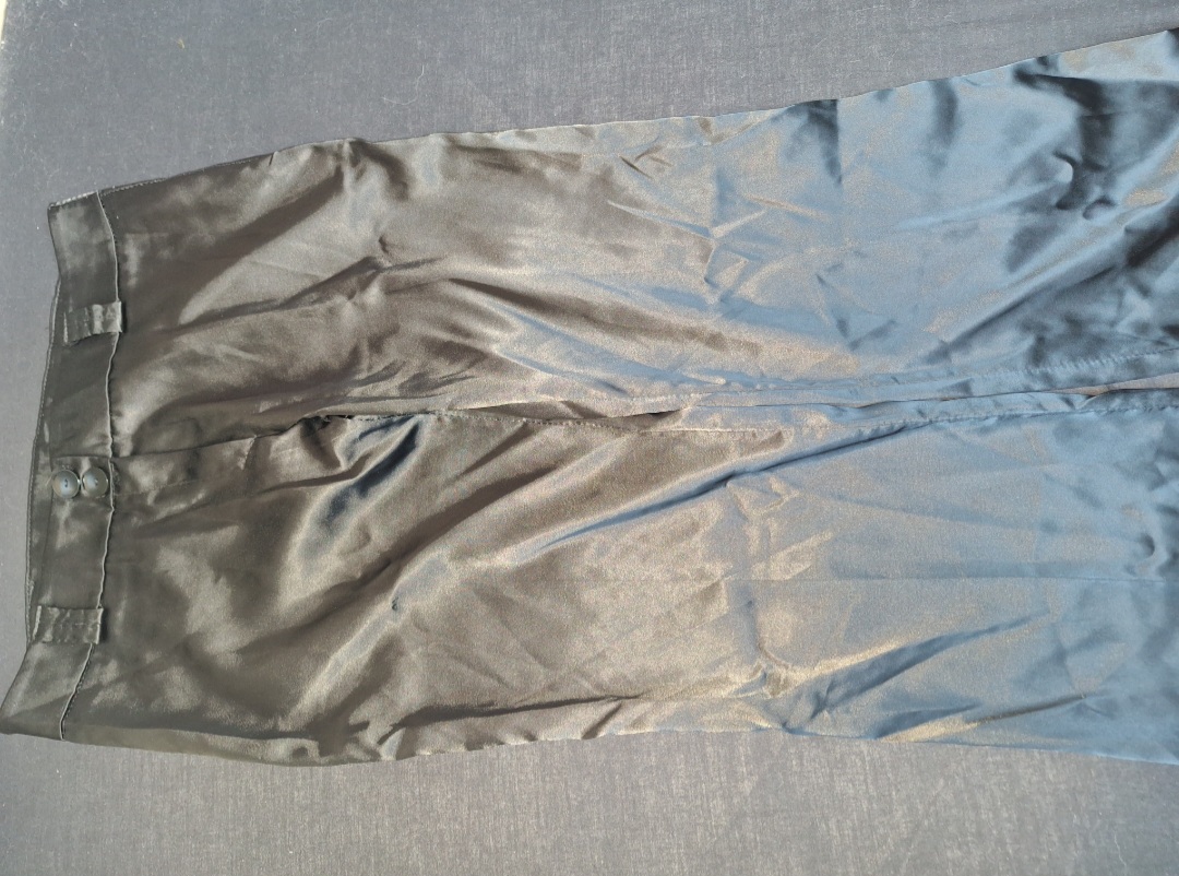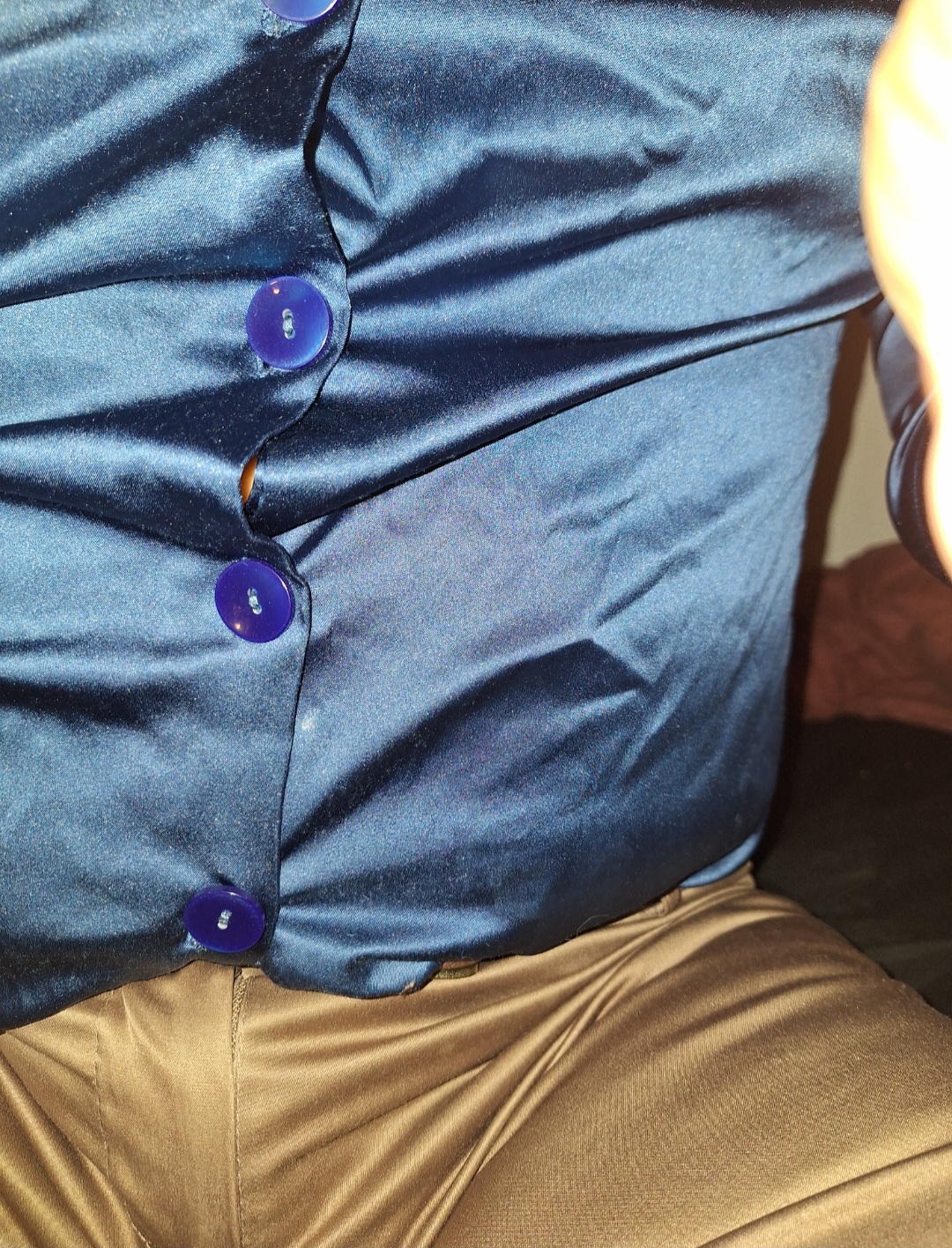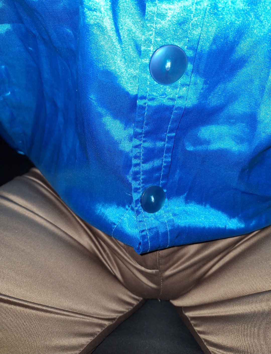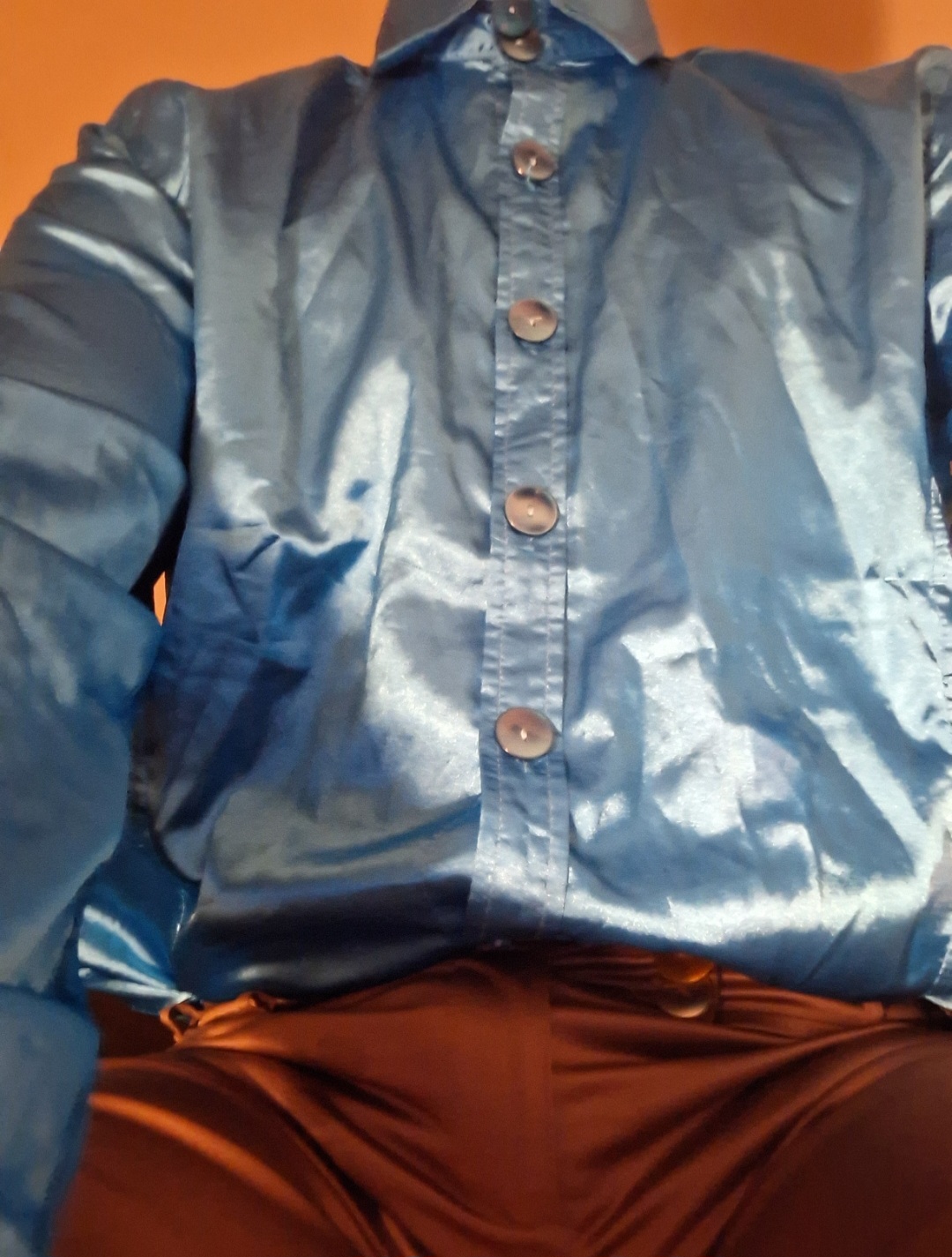 My wife's navy blue blouse and brown satin pants, super exciting to wear