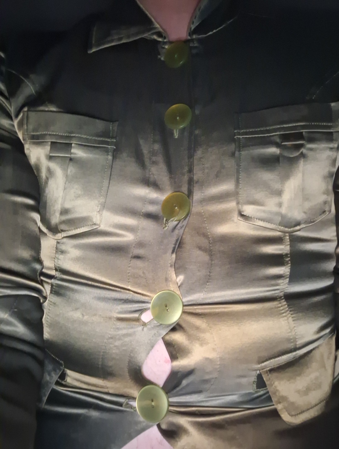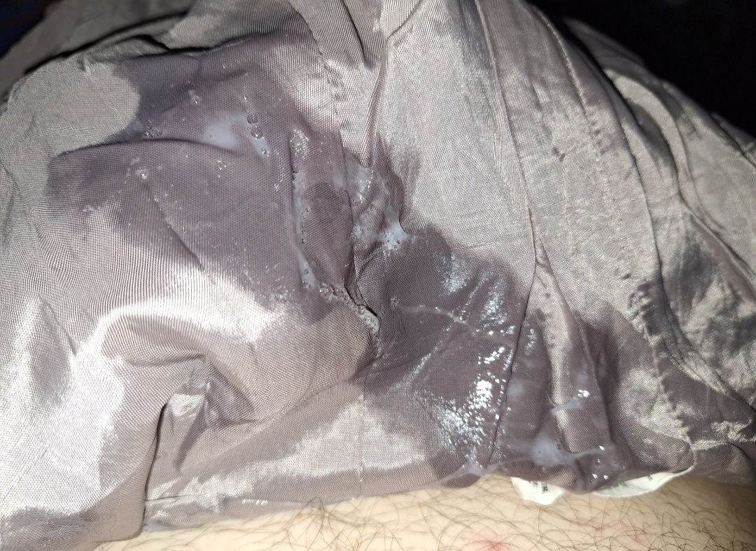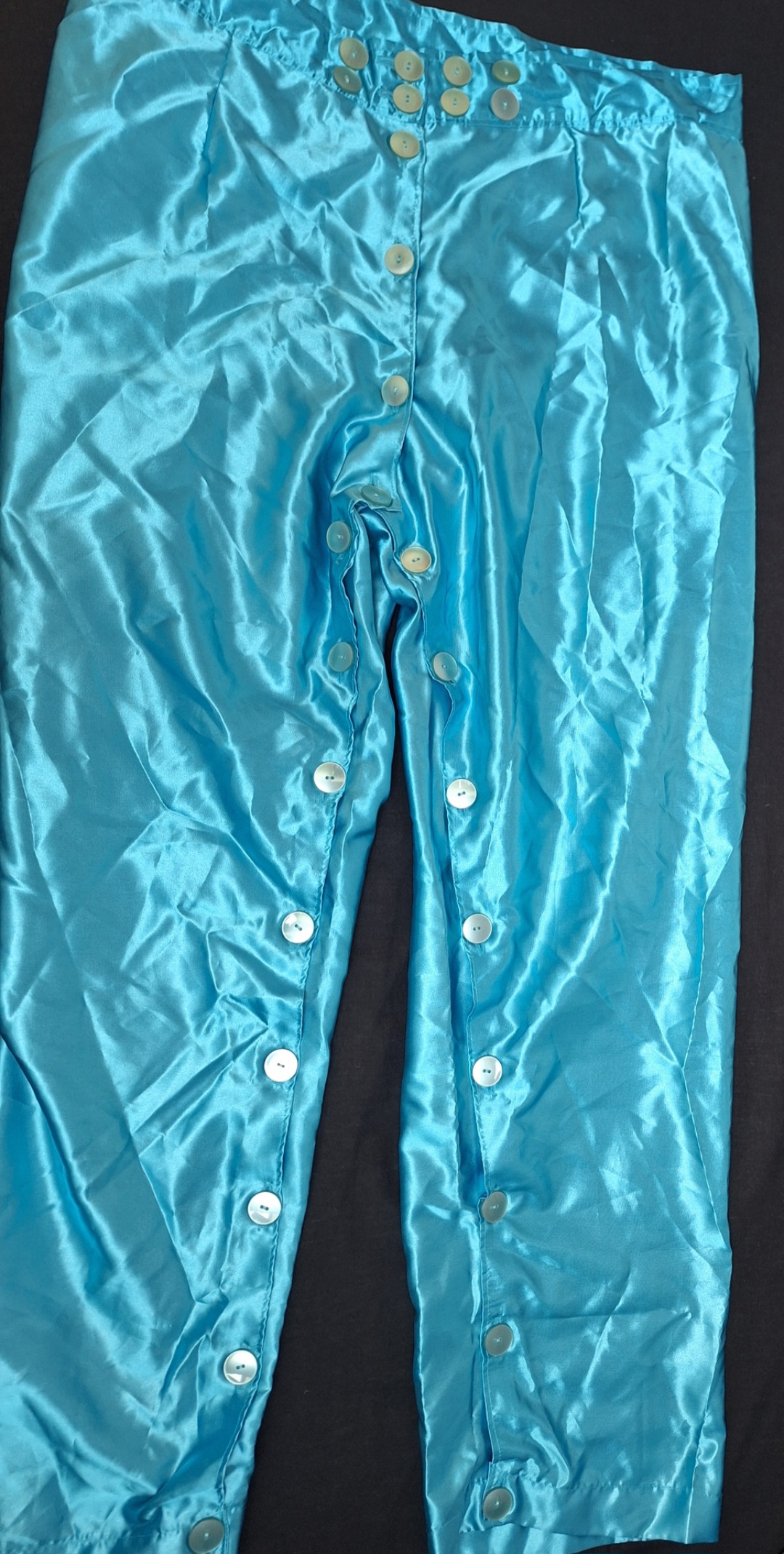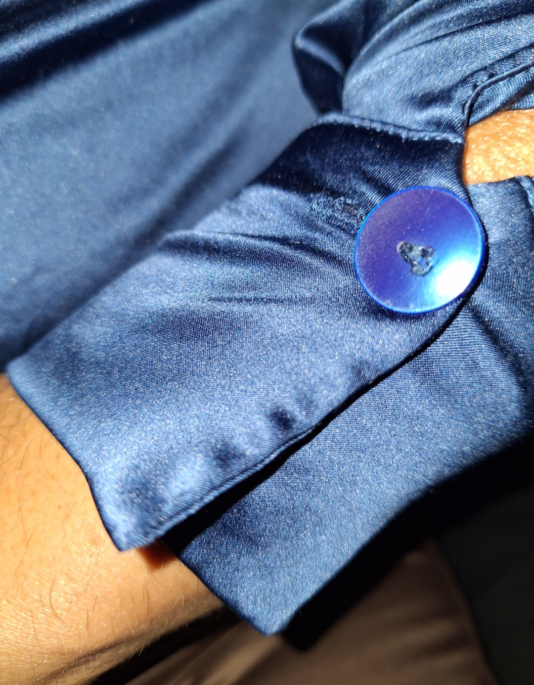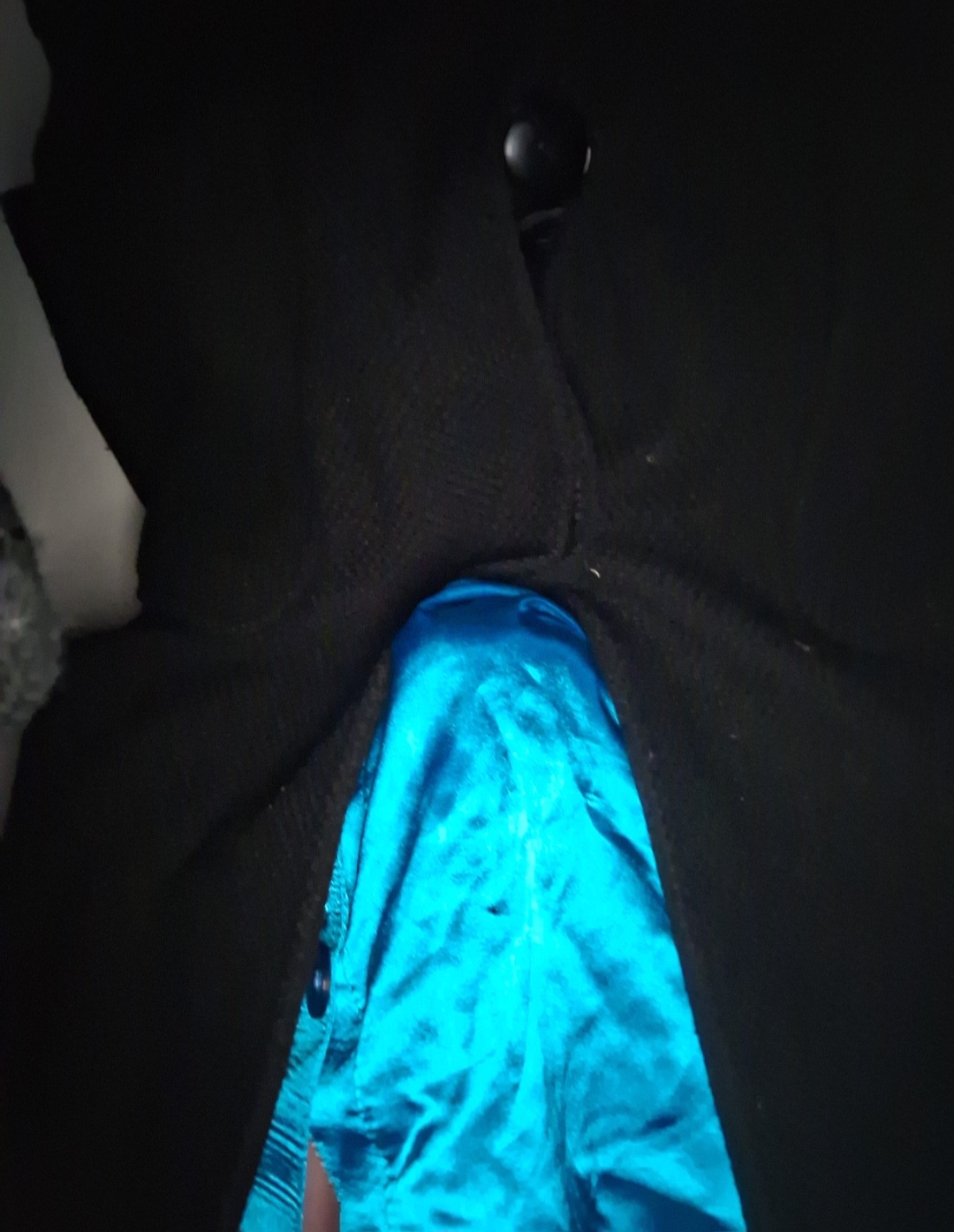My wife's navy blue blouse and brown satin pants, super exciting to wear