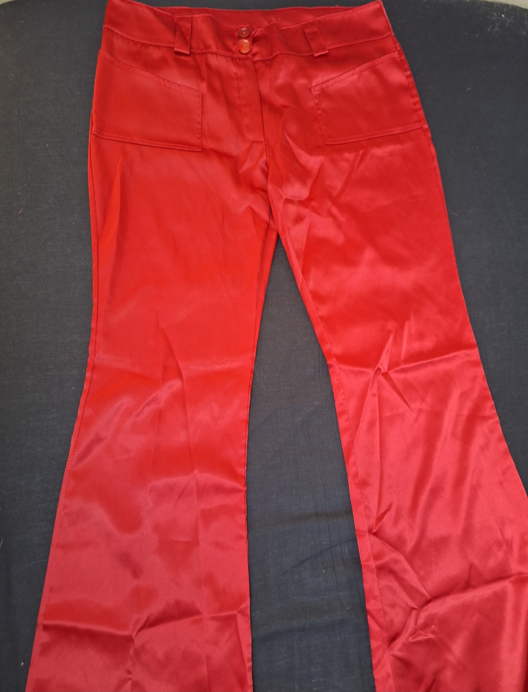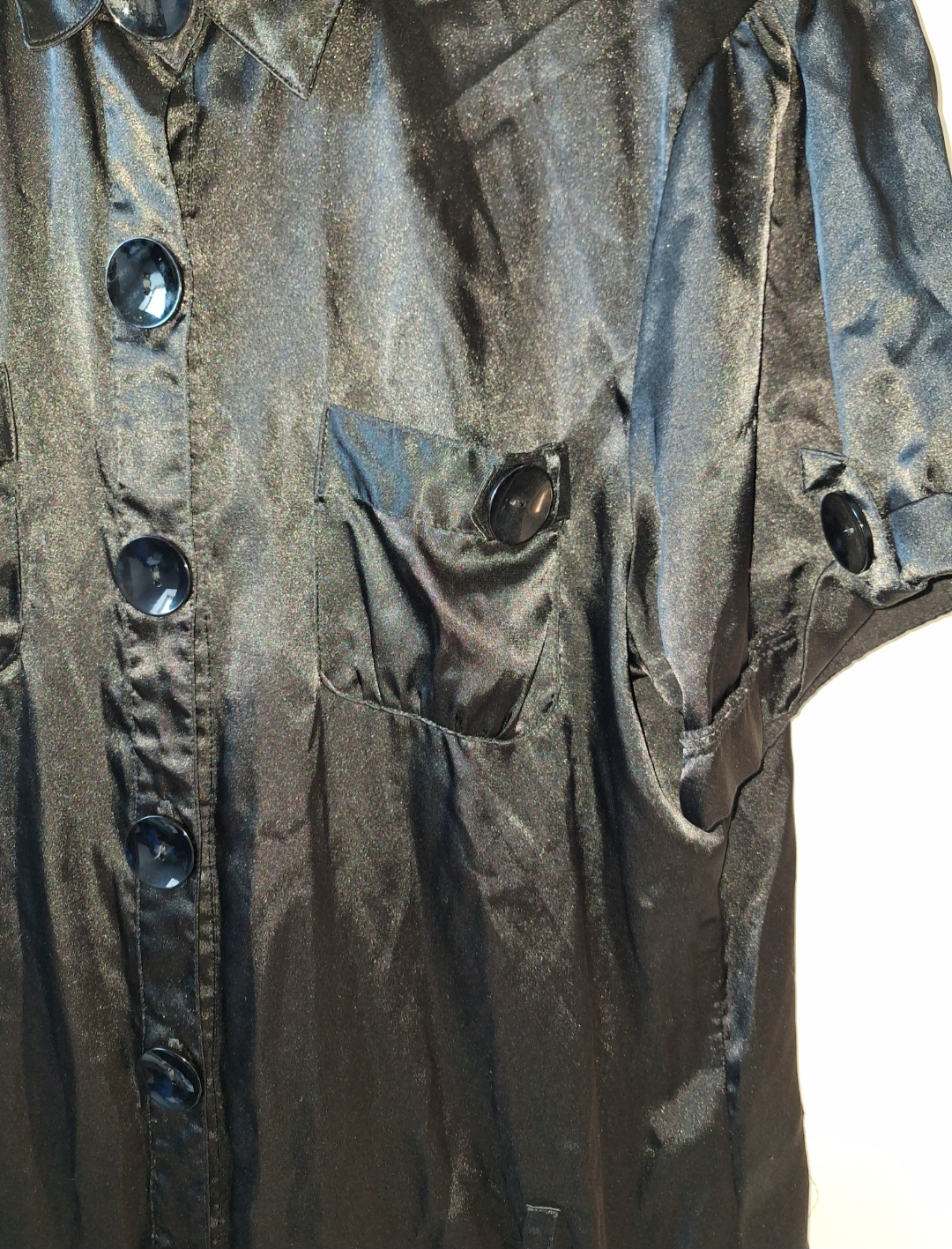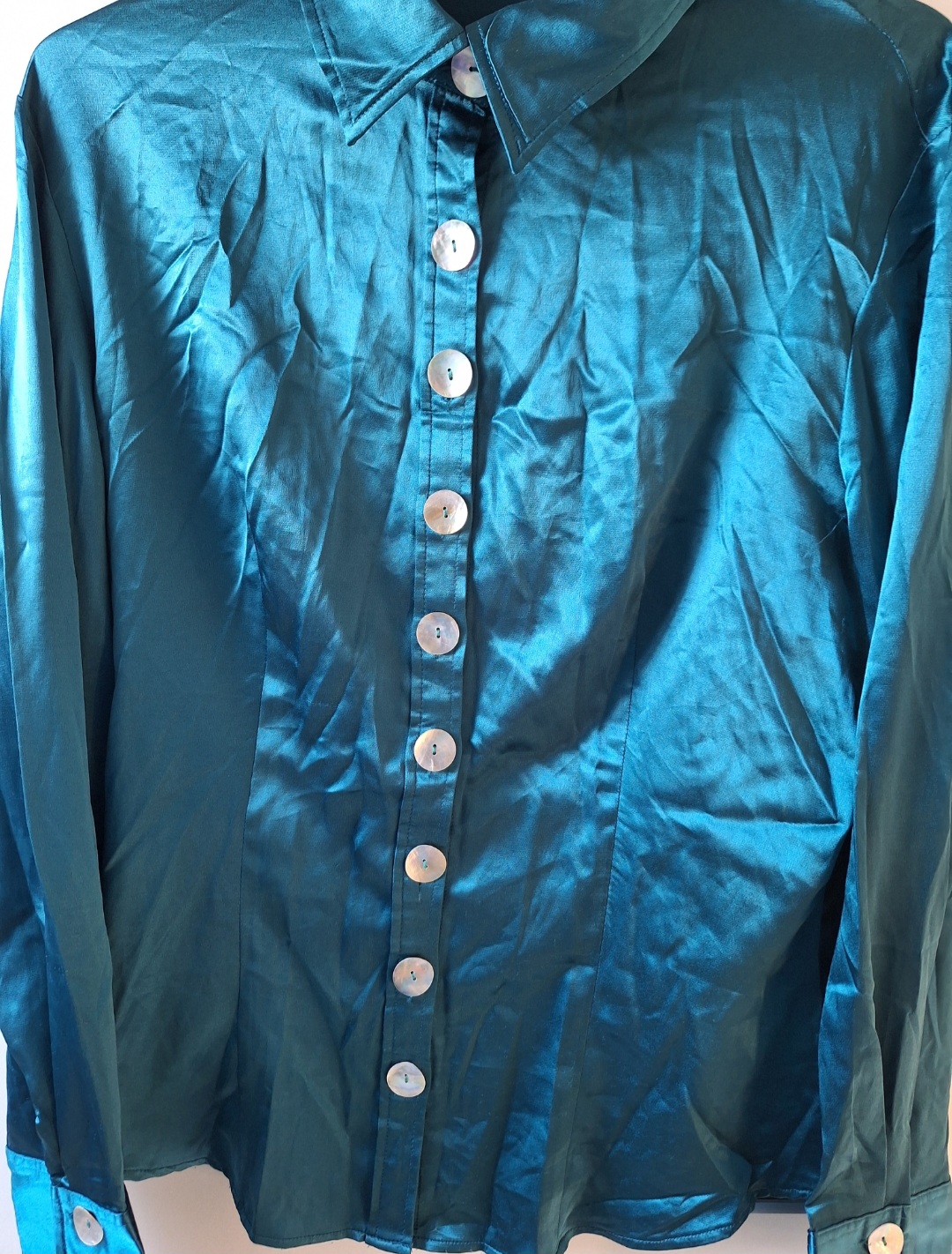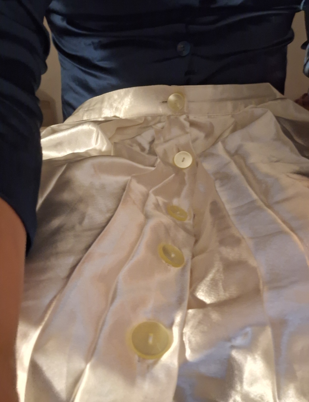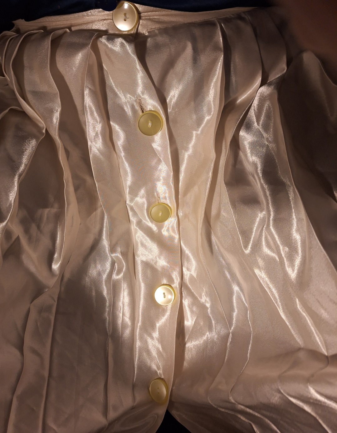 My wife's navy blue blouse and brown satin pants, super exciting to wear