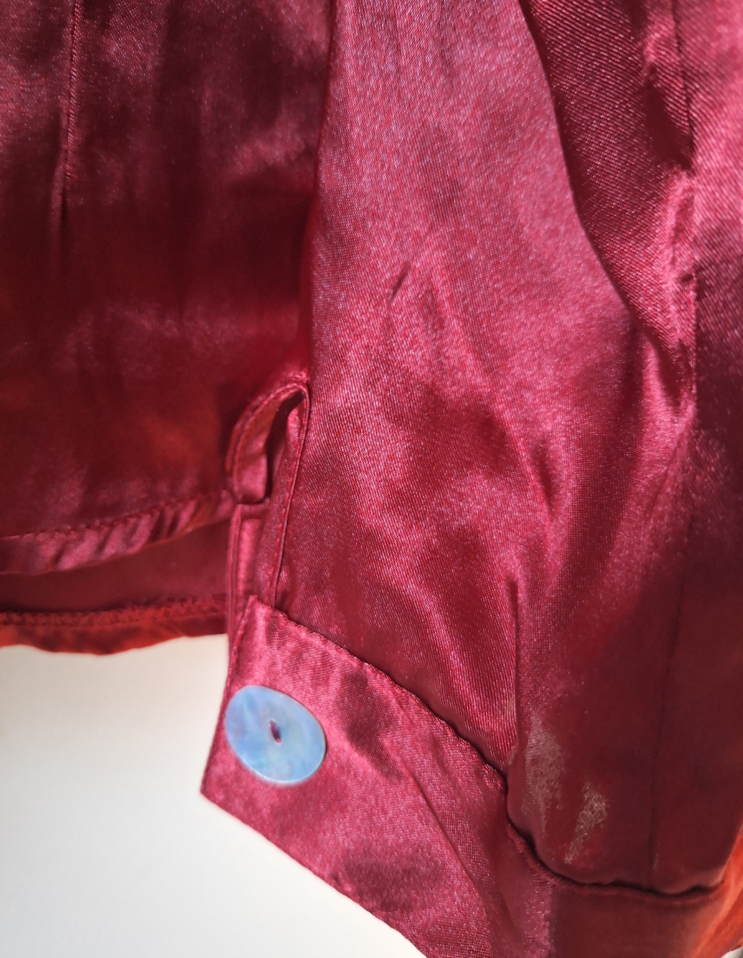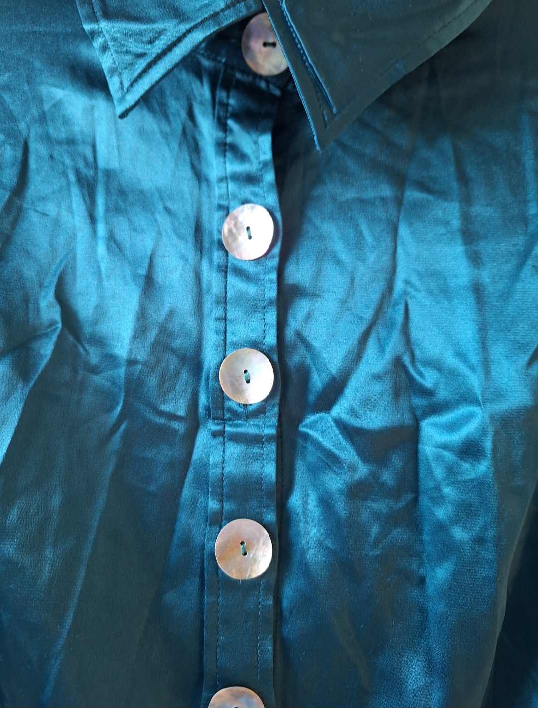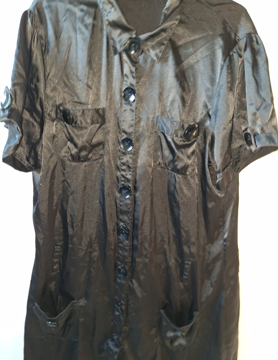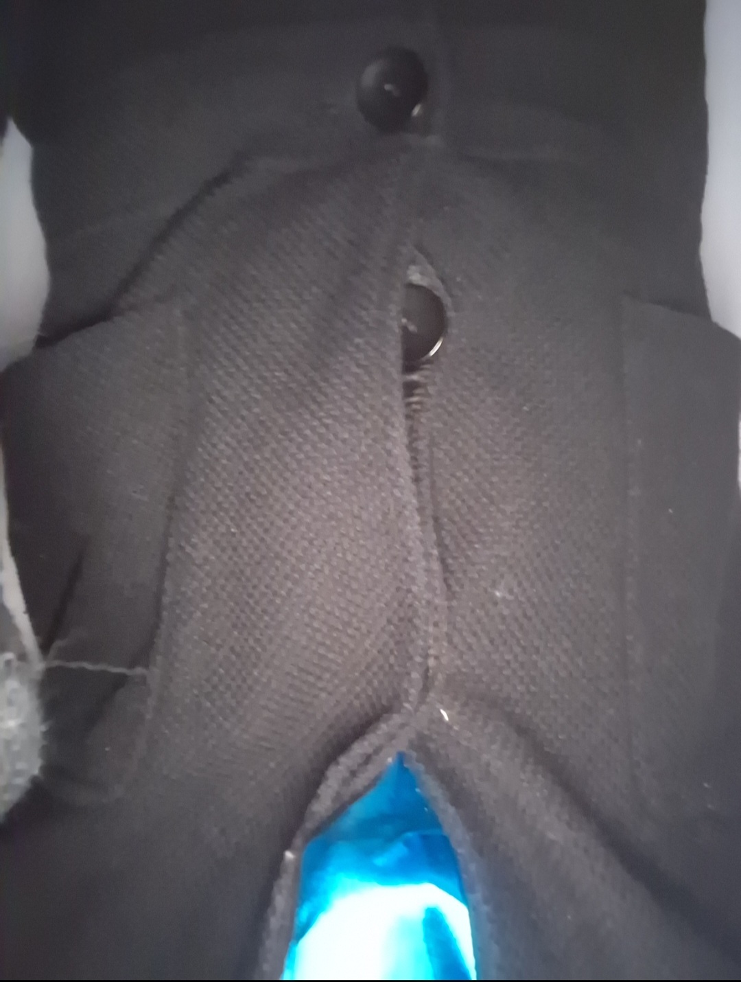My wife's navy blue blouse and brown satin pants, super exciting to wear