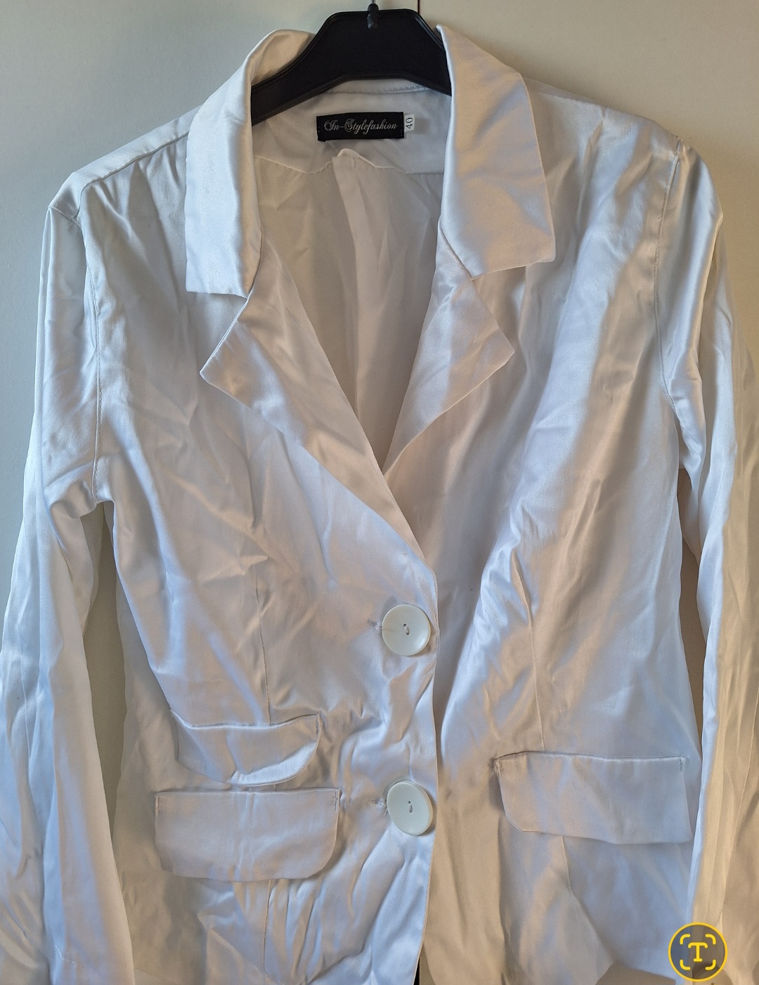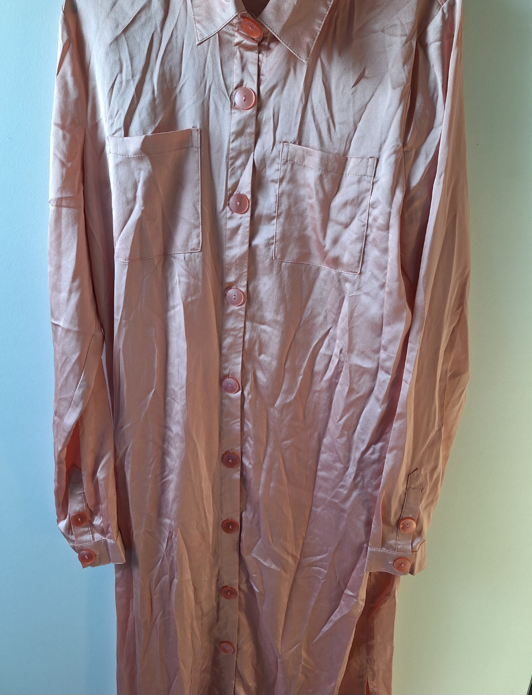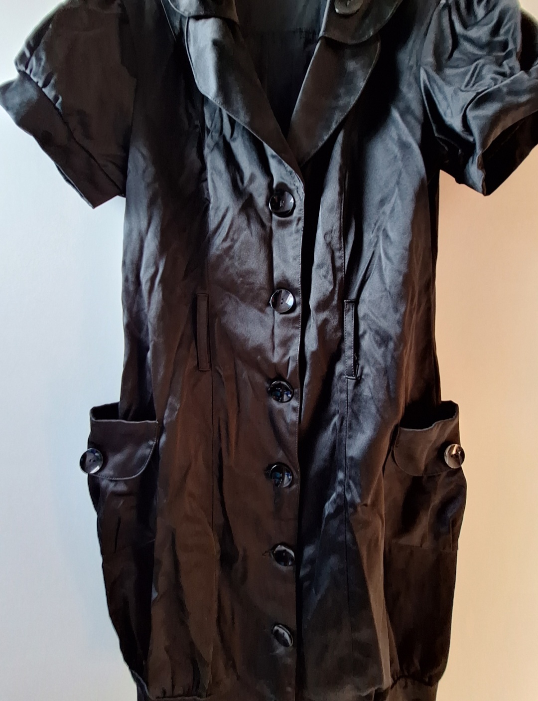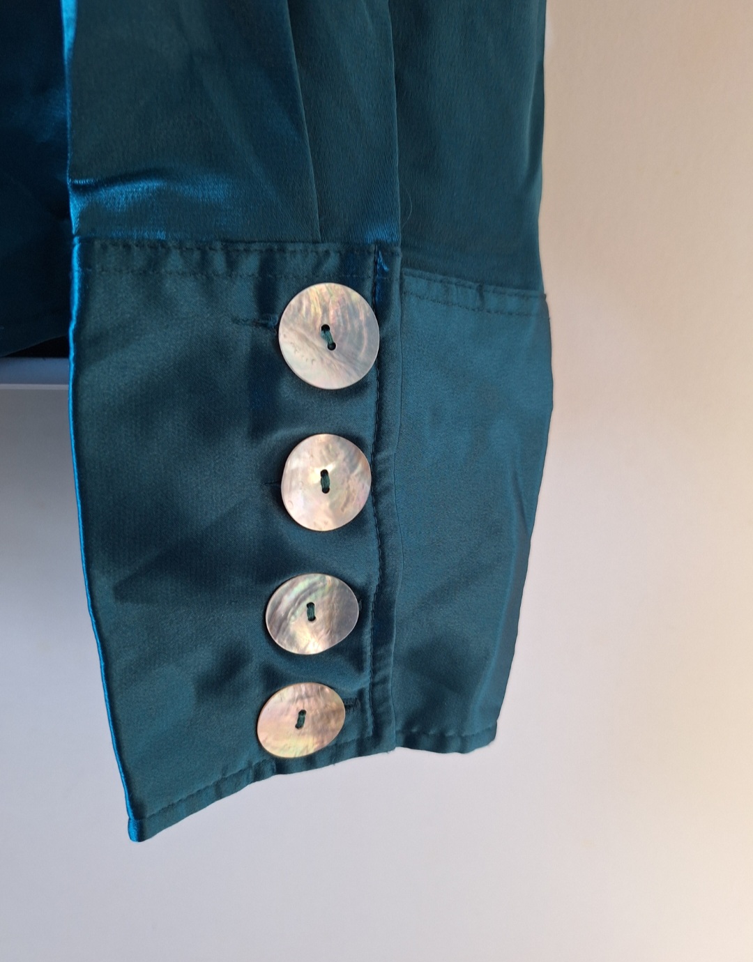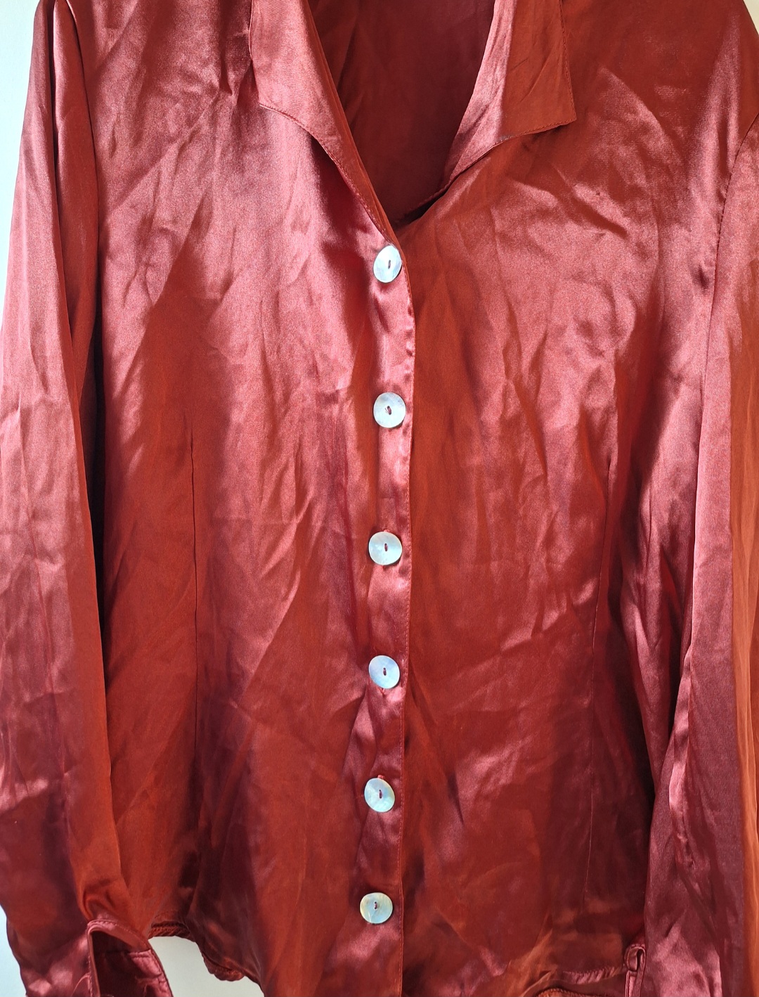 My wife's navy blue blouse and brown satin pants, super exciting to wear